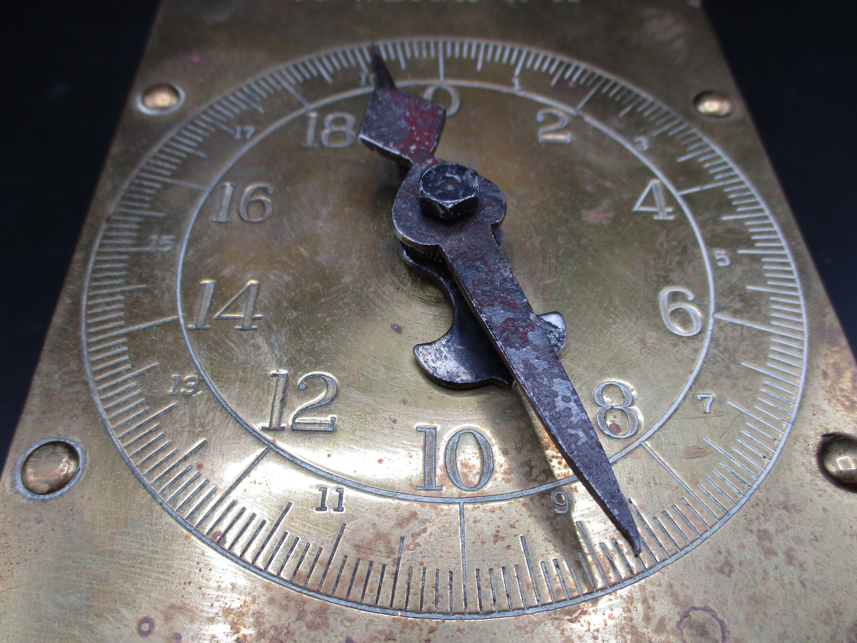 C. Forschner Improved Circular Spring Balance Scale MADE IN USA BRASS AND CAST IRON....ALL METAL! 14.5" Tall (from loop to hook) 4.5" Wide 1.25" deep Weighs 3 lbs 4 oz To weigh 60 lbs by 10th Each 20 lbs is marked on the slide The intermediate weights on the circle