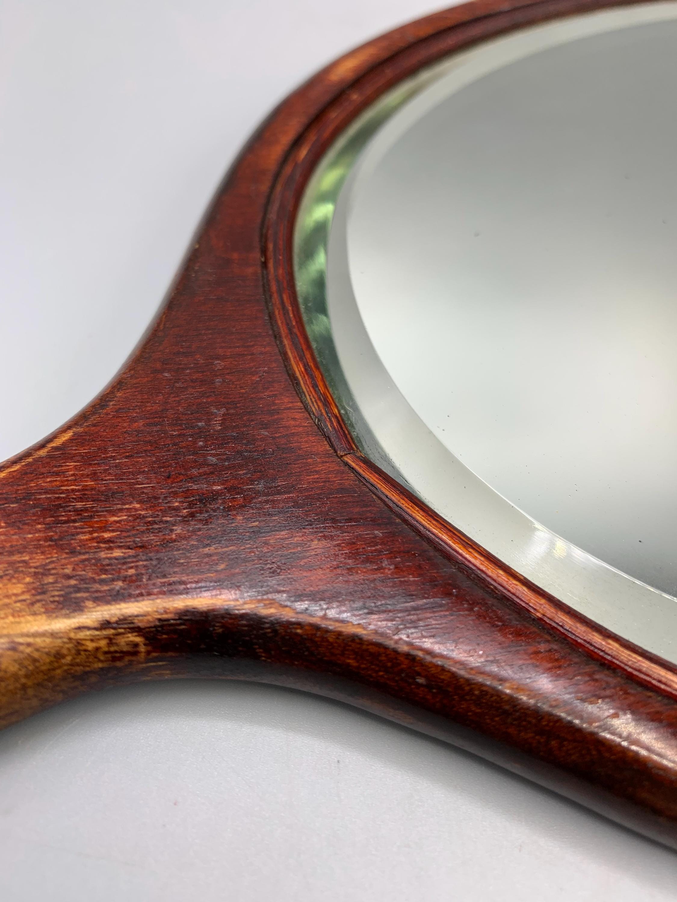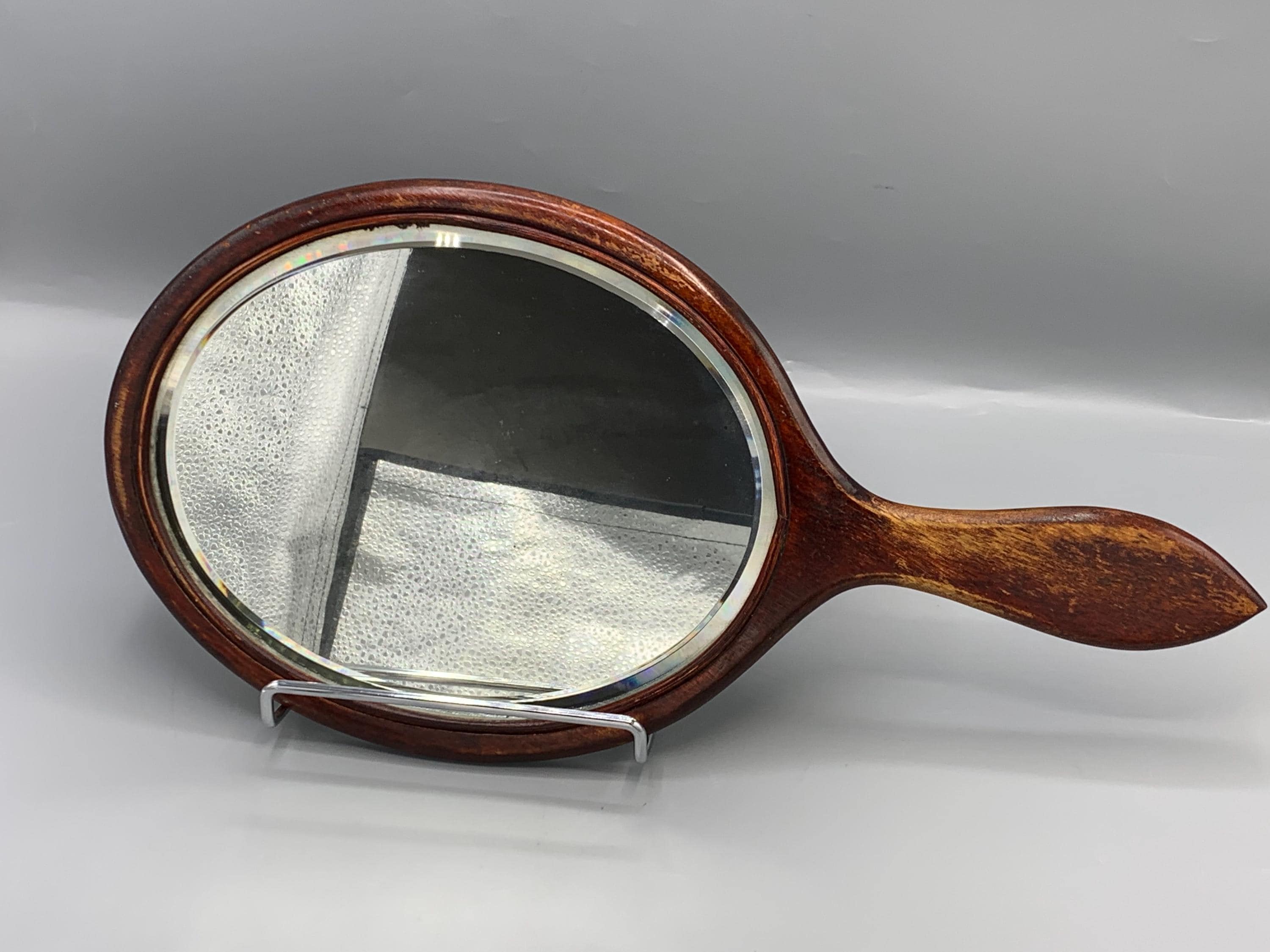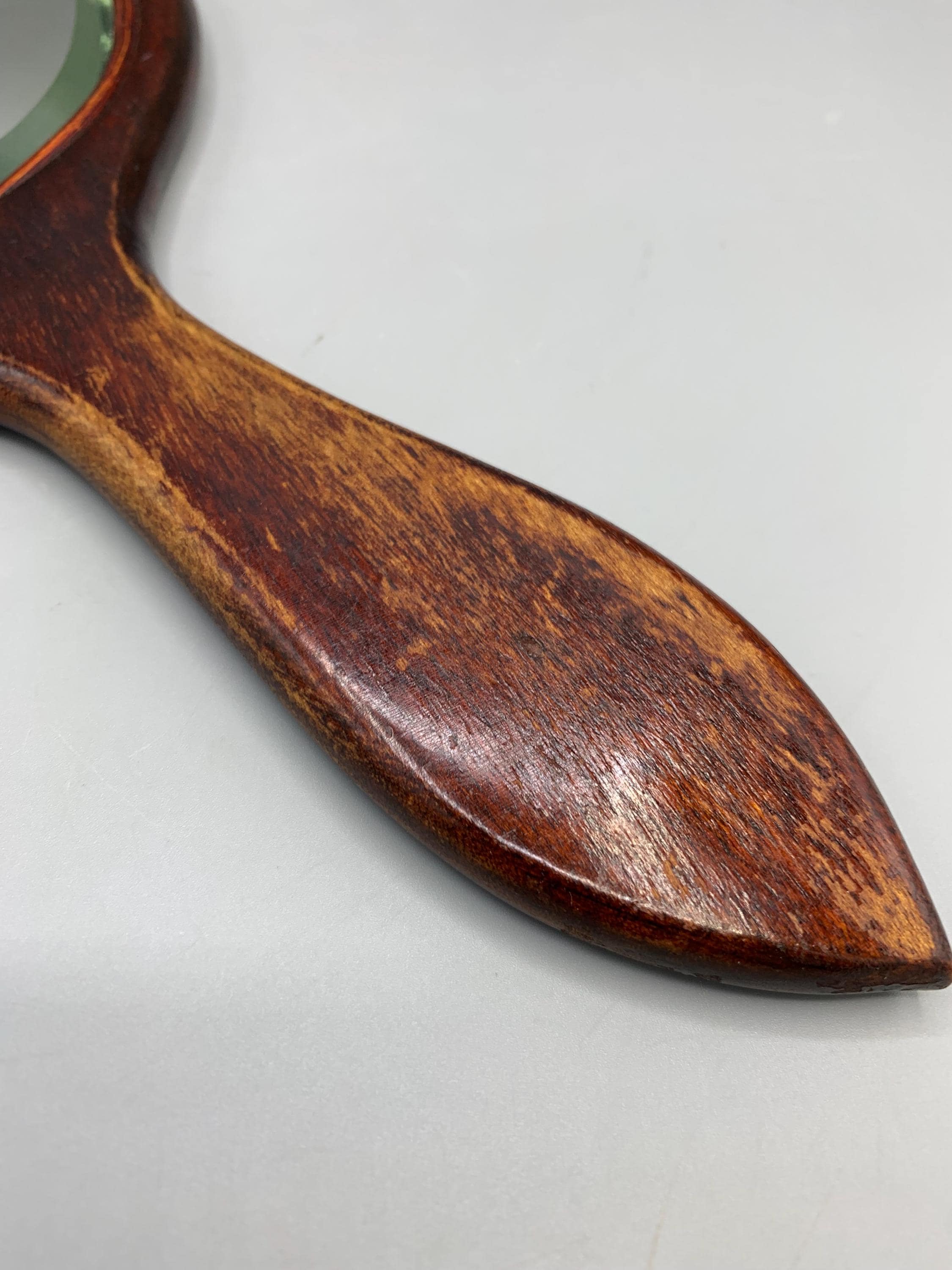 A “regional “ profession, cabinetmakers (carpenters) created matching custom furniture, mirror frames, cabinets, vanities and its accessories from any wood of choice for customers who had the means. Mahogany was the prime selection for numerous customers as well as cabinetmakers. The artisans would custom order mirrored glass from a nearby glass manufacturer to be cut to fit the wooden mirror frames for bedroom sets, vanity mirrors and finally the matching handheld cosmetic mirror. The Victorian Era of design and art ended around 1901 but Mahogany remained the custom choice until around the early 1920s when Oak gained popularity with the Colonial Revival style of the Roaring Twenties .