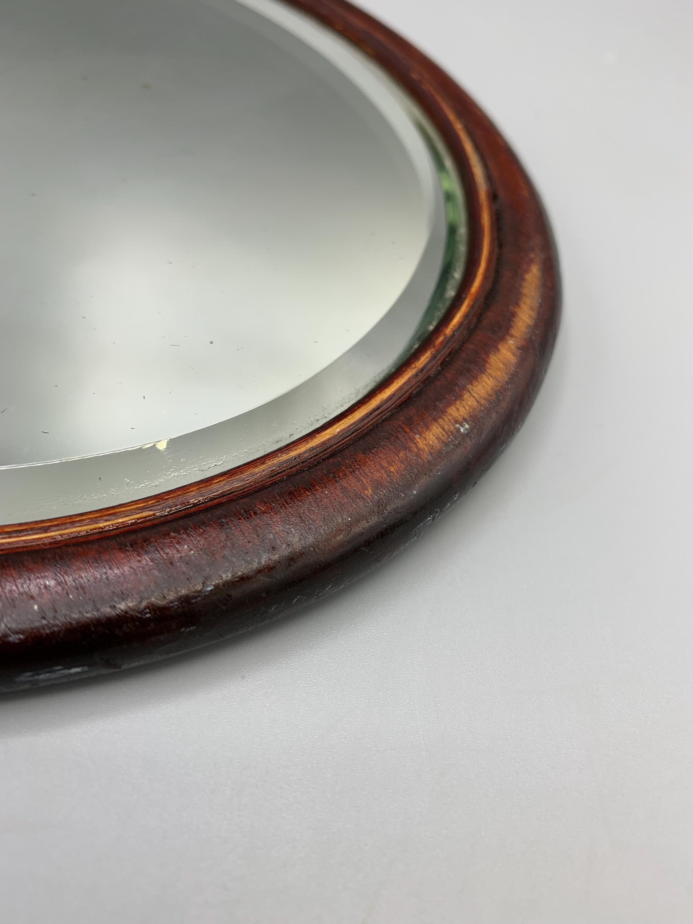 FRAME: Mahogany GLASS: Custom Cut Thick Beveled Starphire made with soda and iron oxide. SILVERING (mirror) Silver Nitrate process and done post Mercury Amalgam process (1835). BODY SHAPE: Oval (rare) No cracks or chips in glass True to period real mahogany and NOT acrylic or resin!
