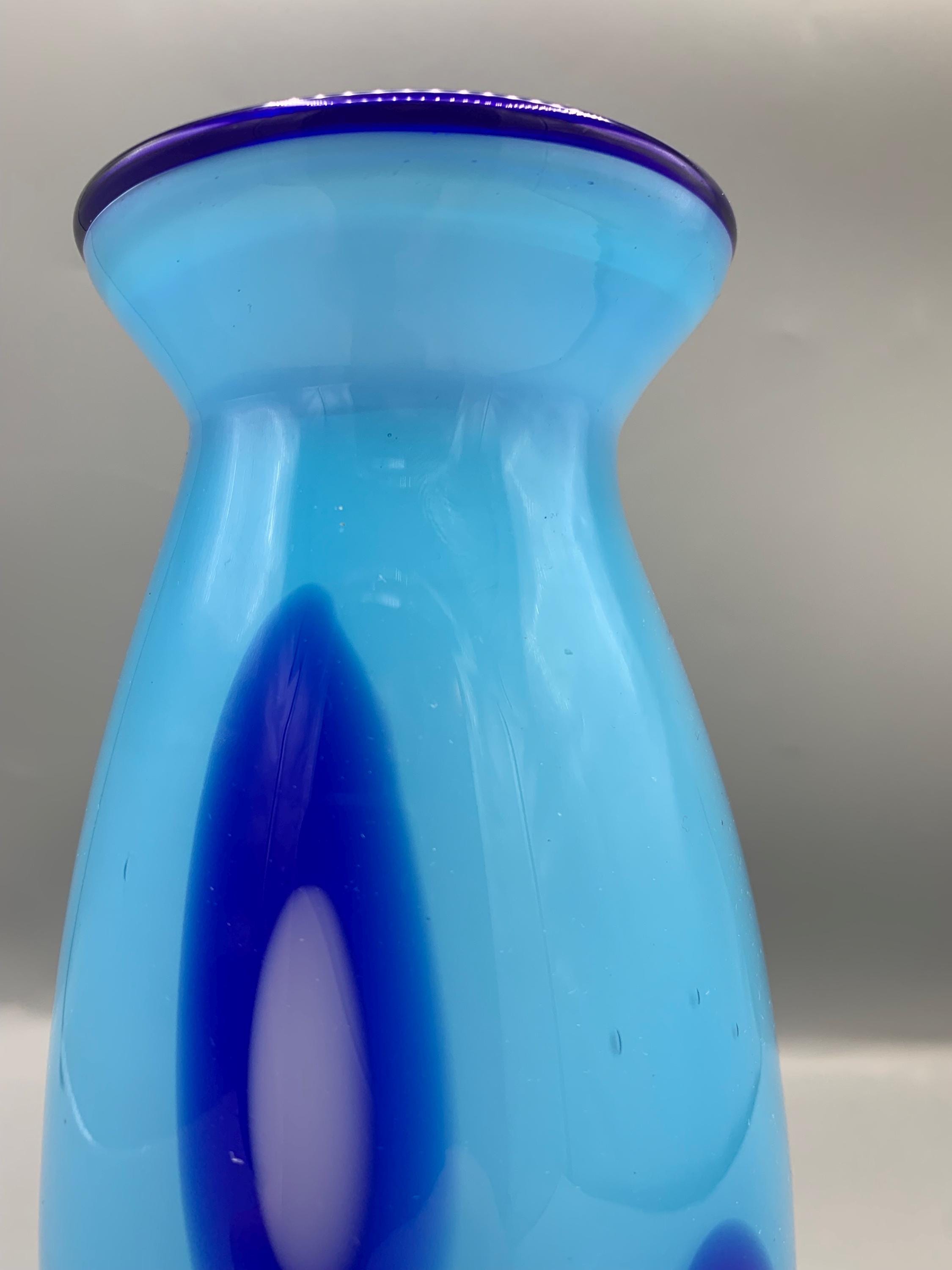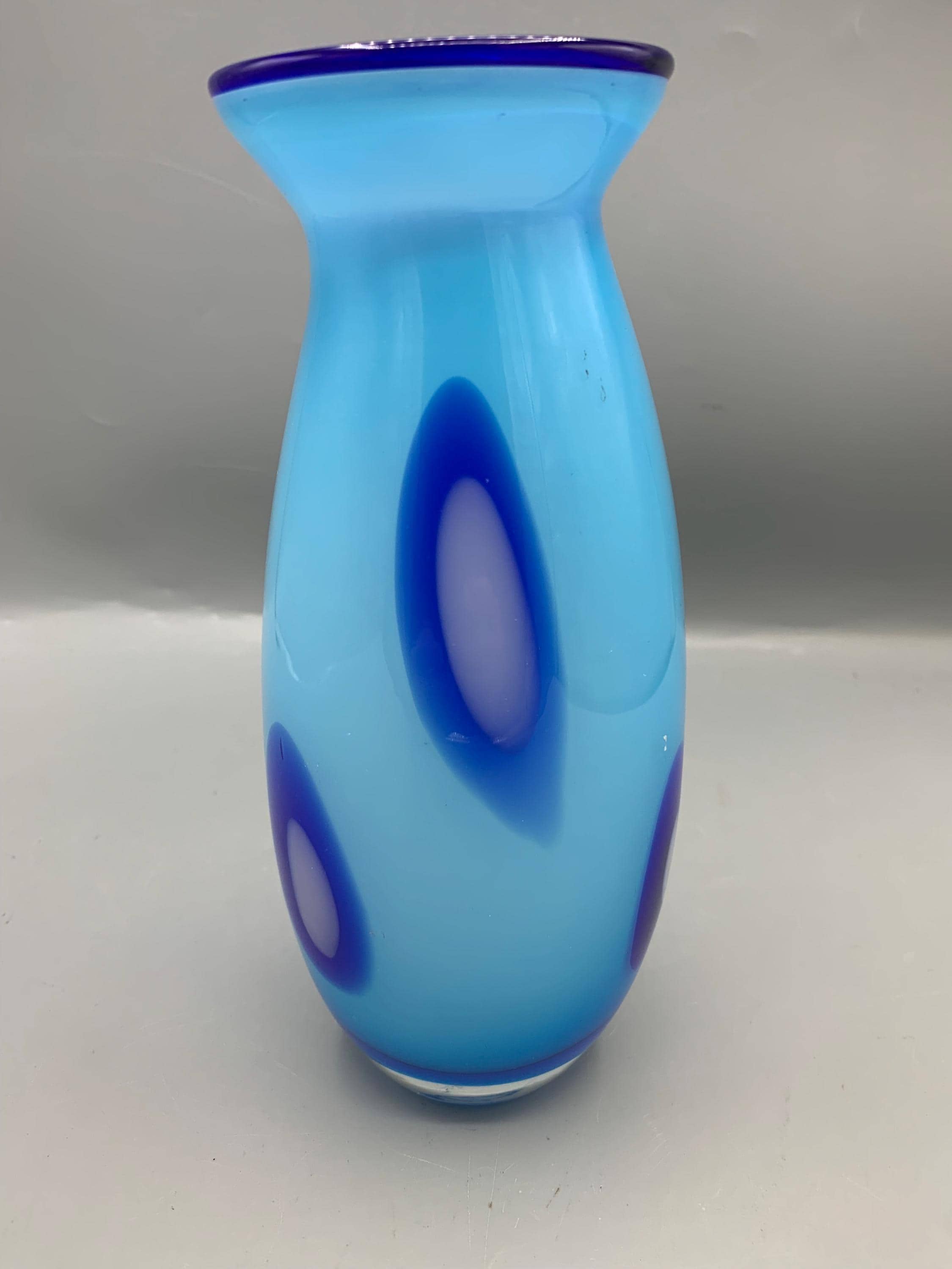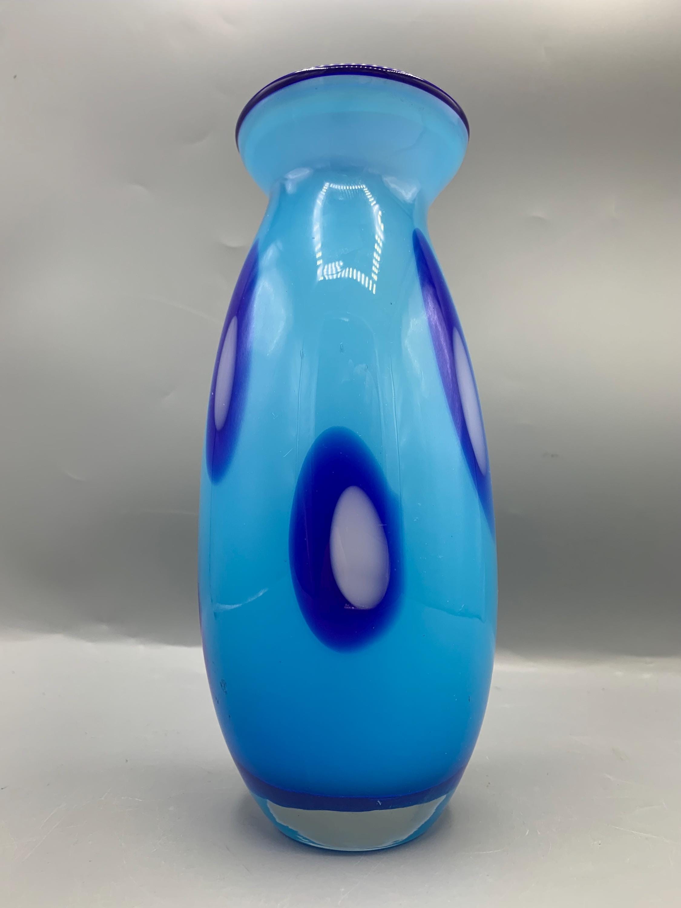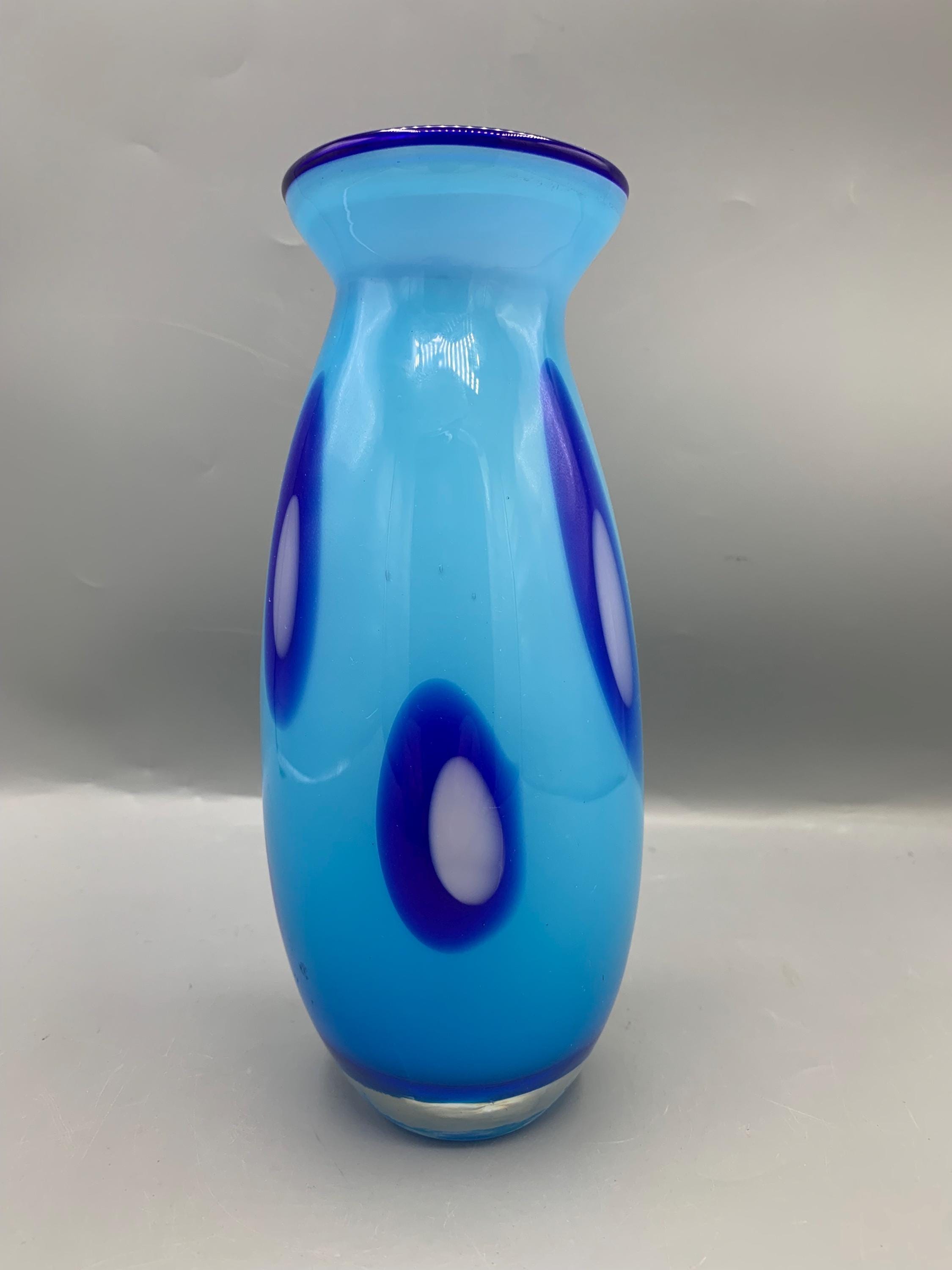 Glass blown “bud vase” decorated in blues and opaque “teardrop” designed windows. The inner wall of vase is finished with white acrylic paint for durability and for protecting the glass. Weighs 1 pound 12 ounces Stands 8.25” Base diameter is 3” Vase circumference is 11” Great Condition-No cracks Item was picked in Fort Worth, TX by MemoryLaneVintiques (estate sale) This glass blown vase was designed by Joelson and made by artisan glass makers in China. The finished products are then exported to Joelson Industries, Inc. in Westlake Village, CA. Joelson Industries was founded in 1988 and has its roots in seasonal giftware and home décor. From the beginning, Joelson has offered a novel approach to product design that, when combined with exceptional customer service and custom-tailored promotional programs, quickly established Joelson as a key supplier to major grocery, drug, and convenience store chains. Retail outlets such as Kmart, Target, Michael’s, Claire’s , and even Avon have sold Joelson designed imports for decades. Since its inception, Joelson has earned a well-deserved reputation as an innovator of lifestyle products. Their design team constantly strives to originate items that define taste and create the perfect ambience. Joelson Industries, Inc. is also a manufacturer of products themselves but are globally known to provide design and manufacturing for other corporations. Joelson’s expertise in design, sourcing, and production of products cover everything like hot impulse items, seasonal giftware, floral products, general merchandise, C-Store items, branded merchandise and even apparel. Joelson still provides products to over a 100 different retailers.
