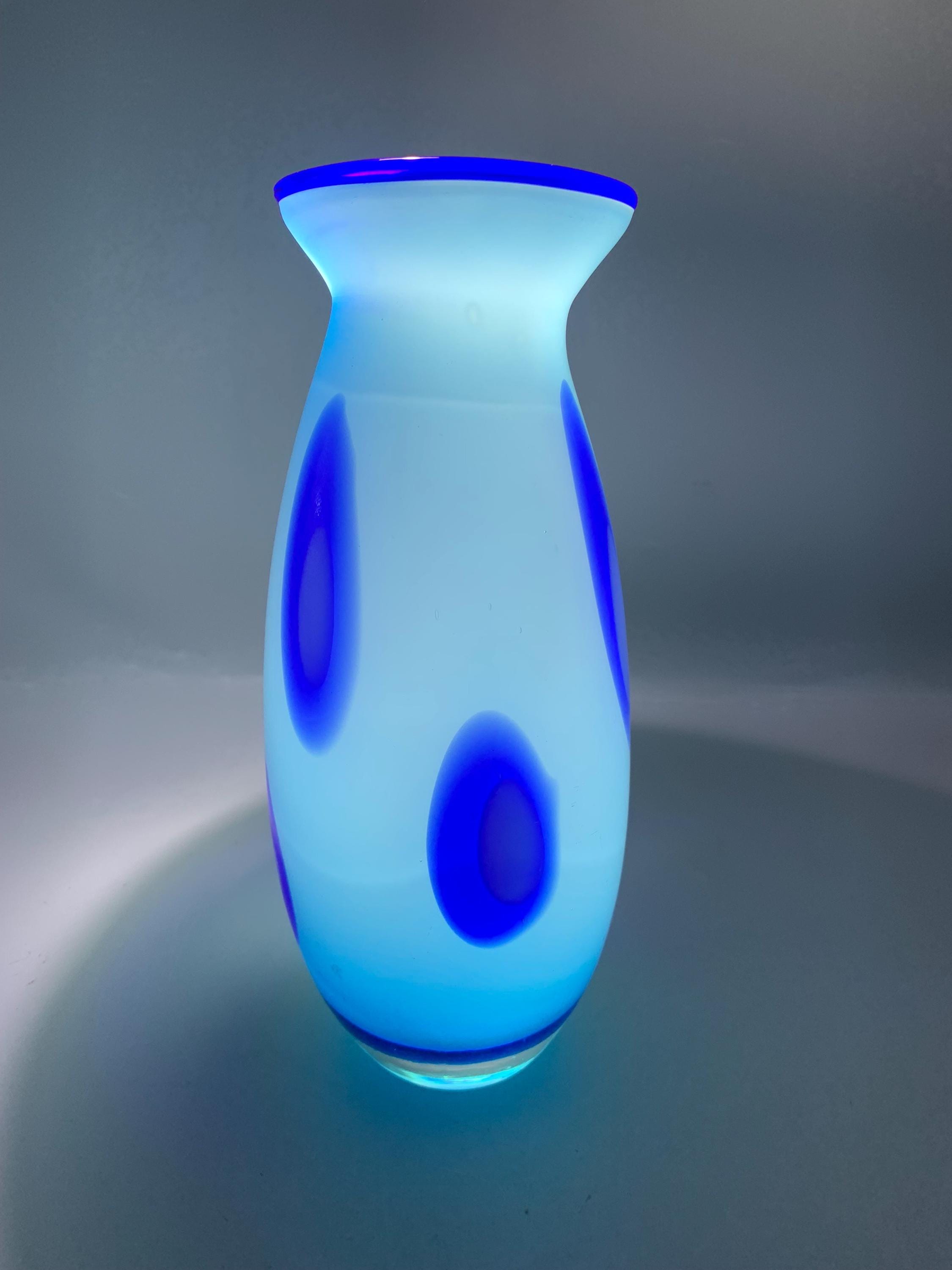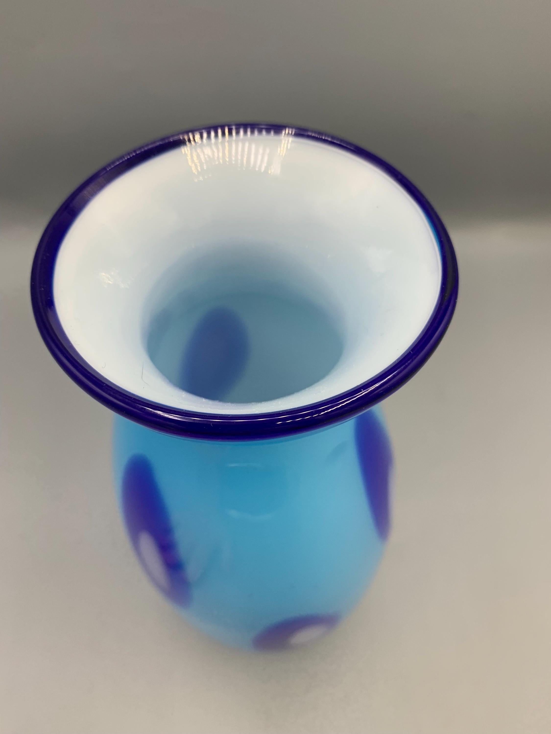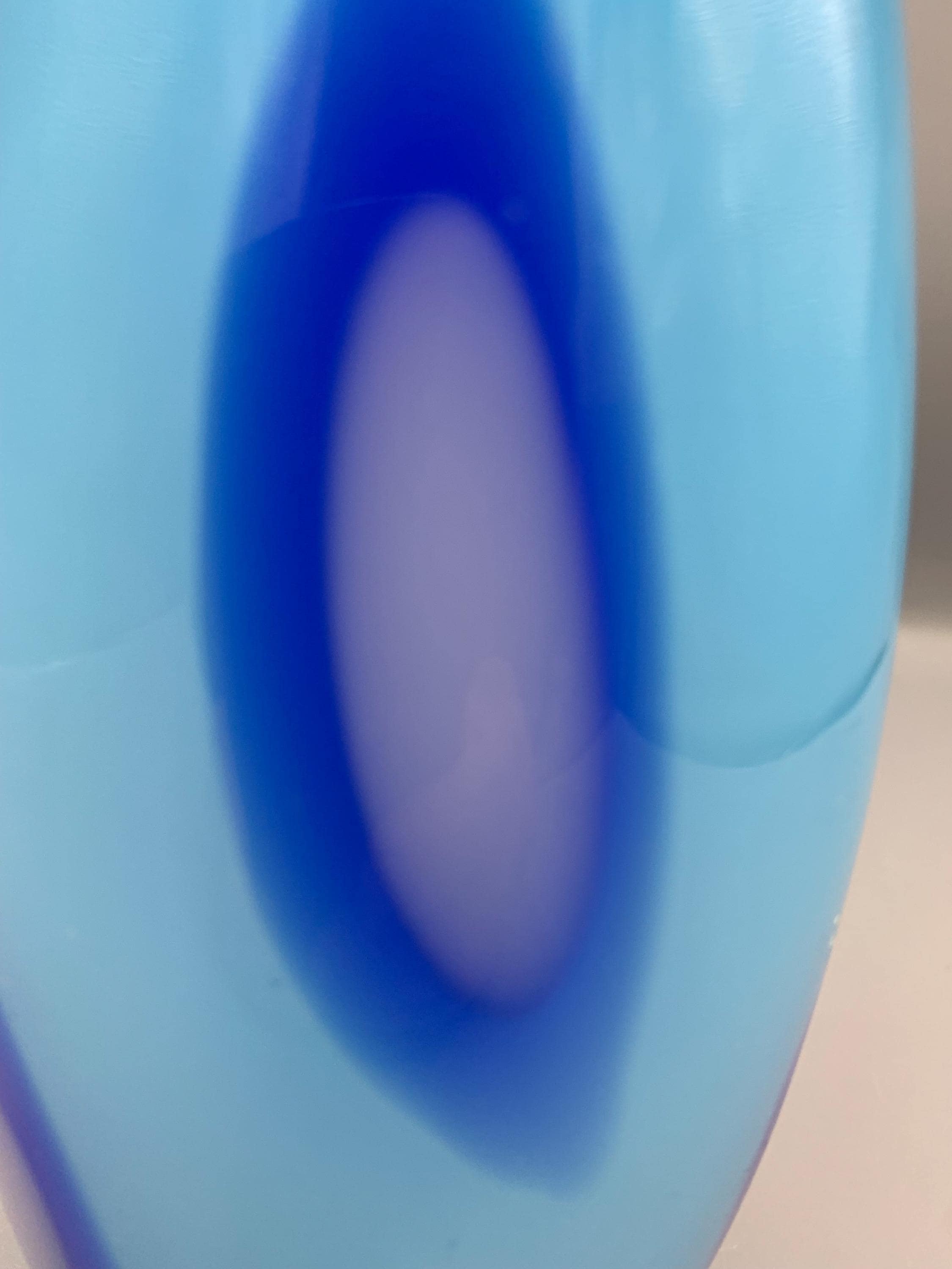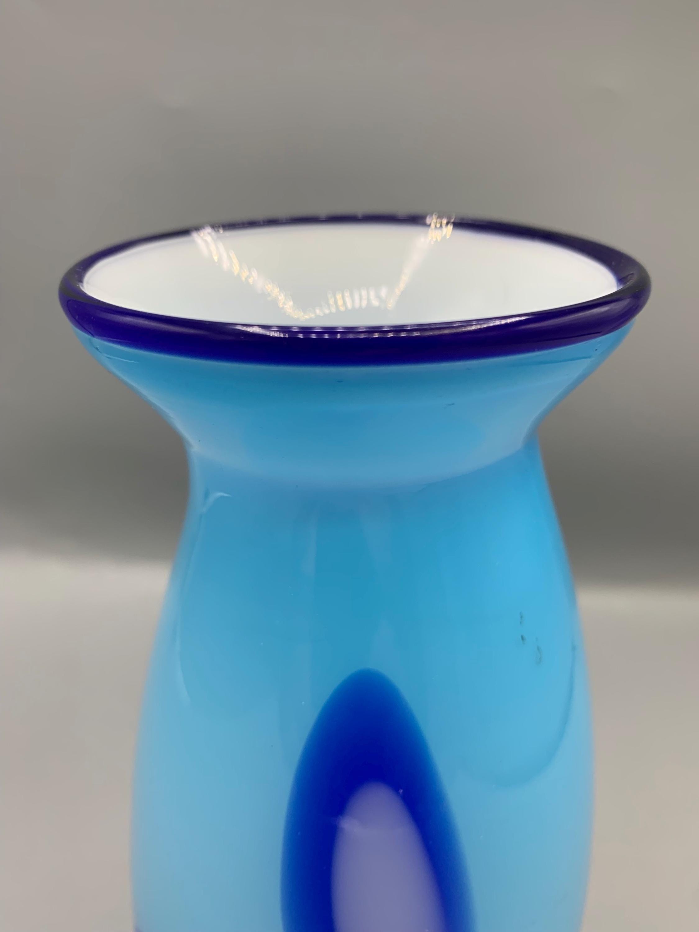 Glass blown “bud vase” decorated in blues and opaque “teardrop” designed windows. The inner wall of vase is finished with white acrylic paint for durability and for protecting the glass. Weighs 1 pound 12 ounces Stands 8.25” Base diameter is 3” Vase circumference is 11” Great Condition-No cracks Item was picked in Fort Worth, TX by MemoryLaneVintiques (estate sale) This glass blown vase was designed by Joelson and made by artisan glass makers in China. The finished products are then exported to Joelson Industries, Inc. in Westlake Village, CA. Joelson Industries was founded in 1988 and has its roots in seasonal giftware and home décor. From the beginning, Joelson has offered a novel approach to product design that, when combined with exceptional customer service and custom-tailored promotional programs, quickly established Joelson as a key supplier to major grocery, drug, and convenience store chains. Retail outlets such as Kmart, Target, Michael’s, Claire’s , and even Avon have sold Joelson designed imports for decades. Since its inception, Joelson has earned a well-deserved reputation as an innovator of lifestyle products. Their design team constantly strives to originate items that define taste and create the perfect ambience. Joelson Industries, Inc. is also a manufacturer of products themselves but are globally known to provide design and manufacturing for other corporations. Joelson’s expertise in design, sourcing, and production of products cover everything like hot impulse items, seasonal giftware, floral products, general merchandise, C-Store items, branded merchandise and even apparel. Joelson still provides products to over a 100 different retailers.