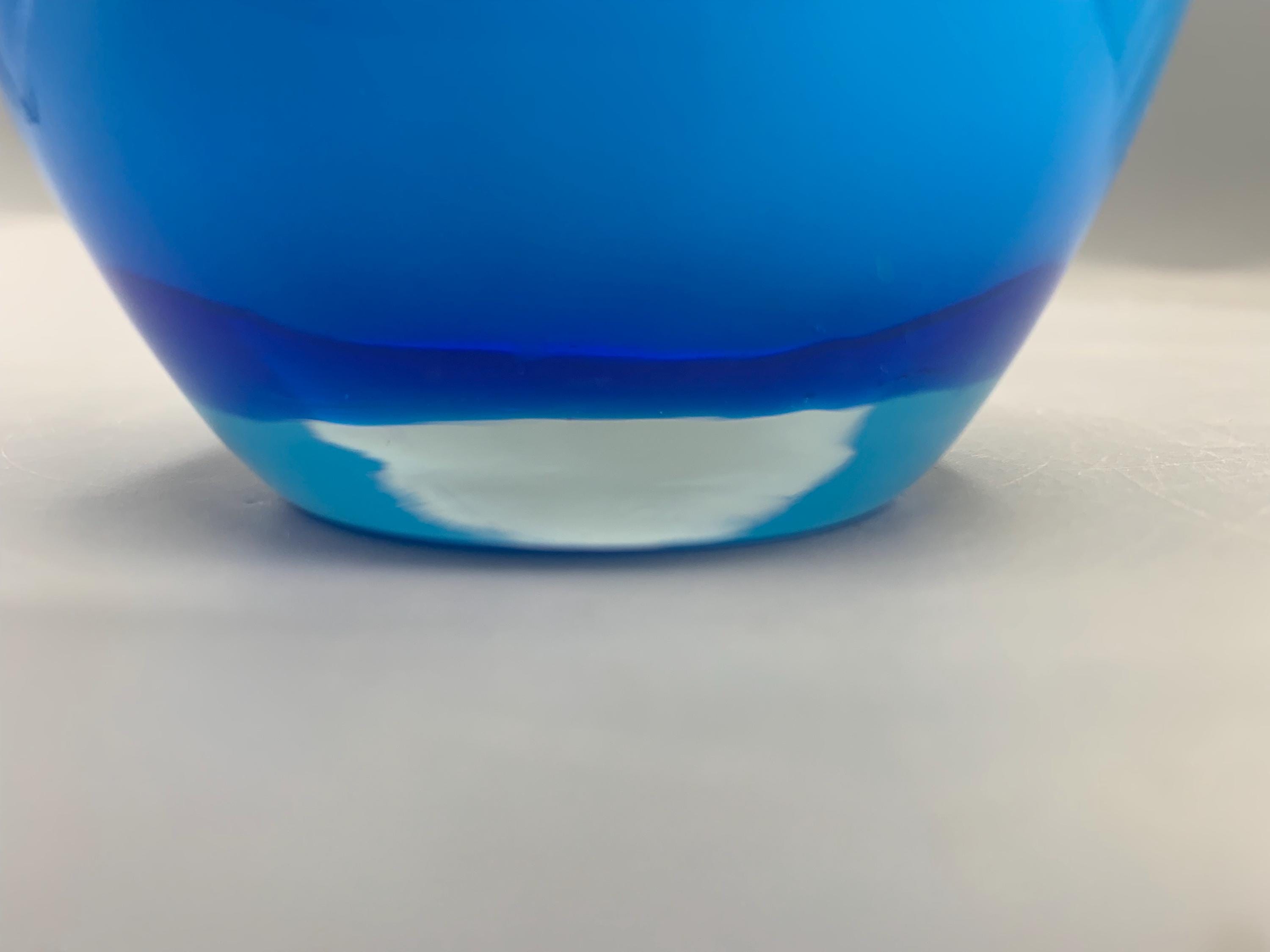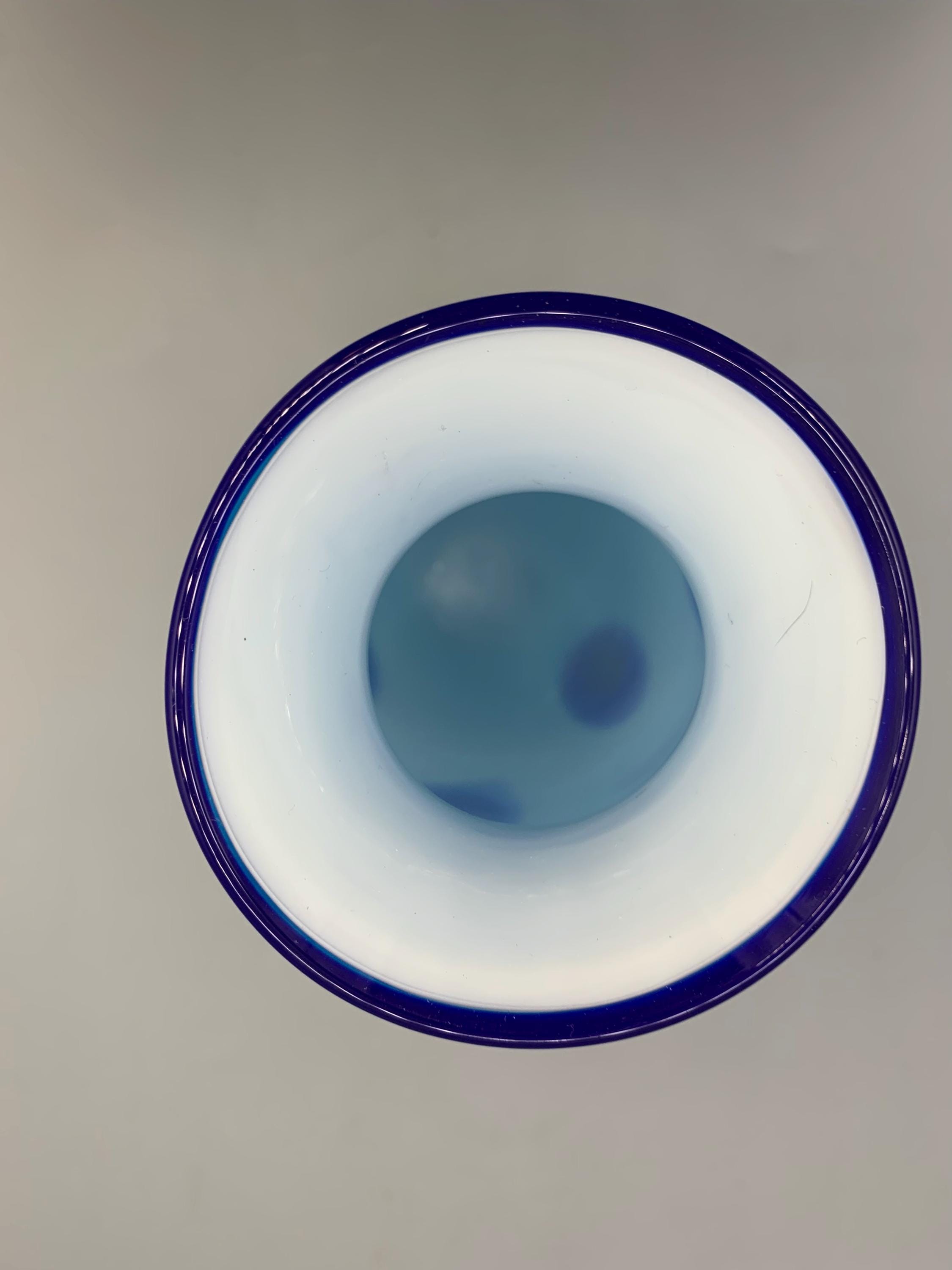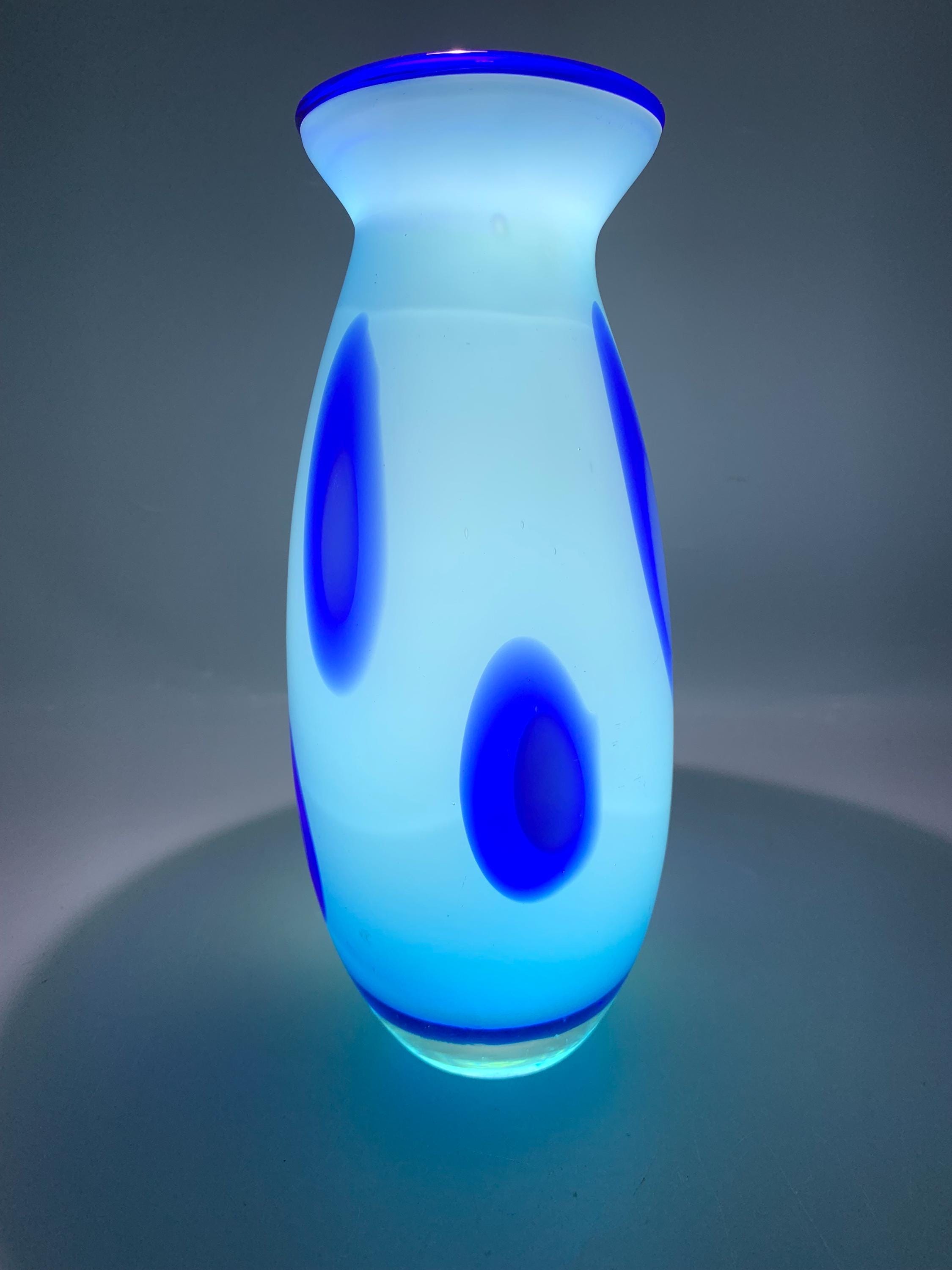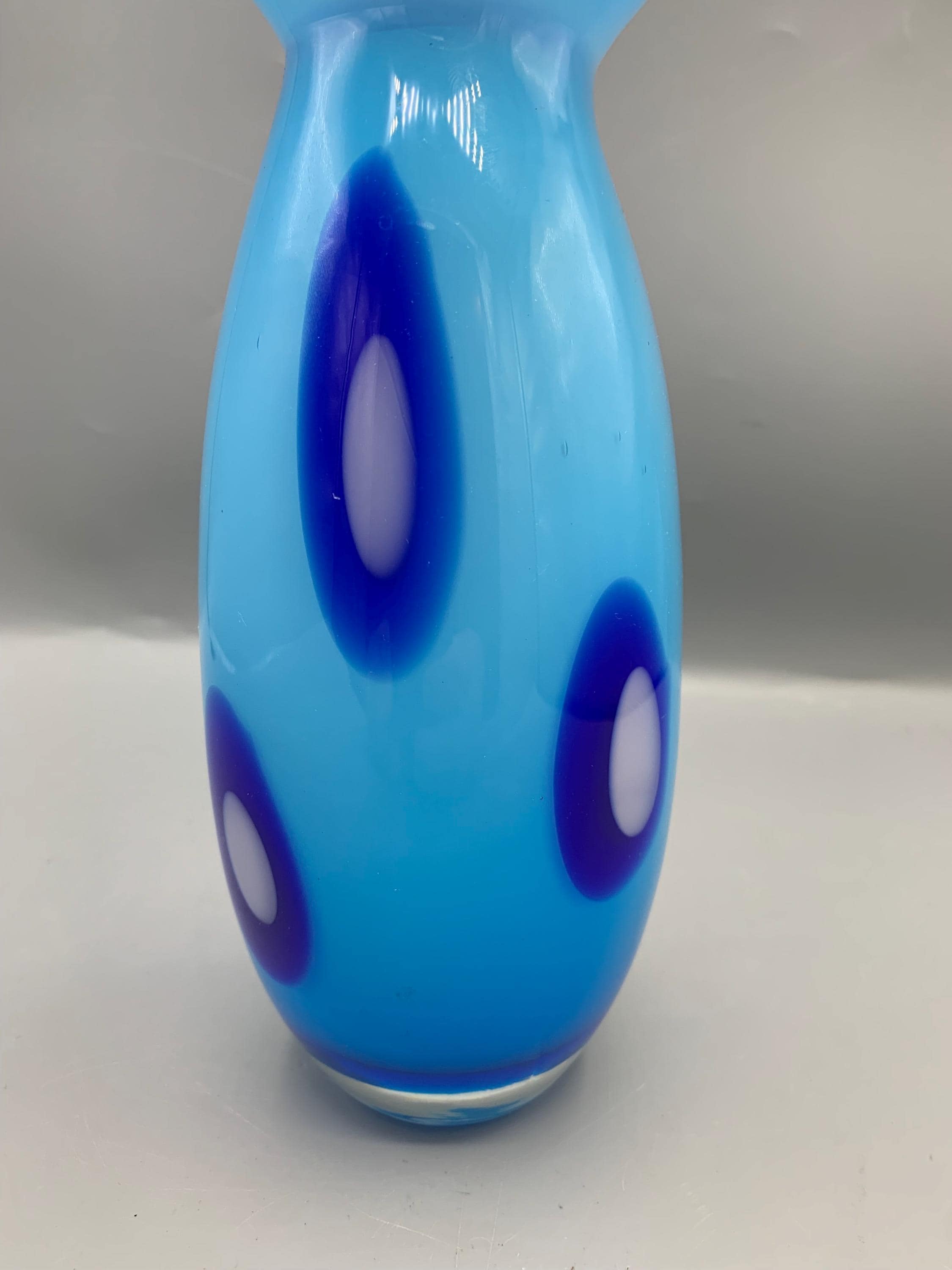 Glass blown “bud vase” decorated in blues and opaque “teardrop” designed windows. The inner wall of vase is finished with white acrylic paint for durability and for protecting the glass. Weighs 1 pound 12 ounces Stands 8.25” Base diameter is 3” Vase circumference is 11” Great Condition-No cracks Item was picked in Fort Worth, TX by MemoryLaneVintiques (estate sale) This glass blown vase was designed by Joelson and made by artisan glass makers in China. The finished products are then exported to Joelson Industries, Inc. in Westlake Village, CA. Joelson Industries was founded in 1988 and has its roots in seasonal giftware and home décor. From the beginning, Joelson has offered a novel approach to product design that, when combined with exceptional customer service and custom-tailored promotional programs, quickly established Joelson as a key supplier to major grocery, drug, and convenience store chains. Retail outlets such as Kmart, Target, Michael’s, Claire’s , and even Avon have sold Joelson designed imports for decades. Since its inception, Joelson has earned a well-deserved reputation as an innovator of lifestyle products. Their design team constantly strives to originate items that define taste and create the perfect ambience. Joelson Industries, Inc. is also a manufacturer of products themselves but are globally known to provide design and manufacturing for other corporations. Joelson’s expertise in design, sourcing, and production of products cover everything like hot impulse items, seasonal giftware, floral products, general merchandise, C-Store items, branded merchandise and even apparel. Joelson still provides products to over a 100 different retailers.