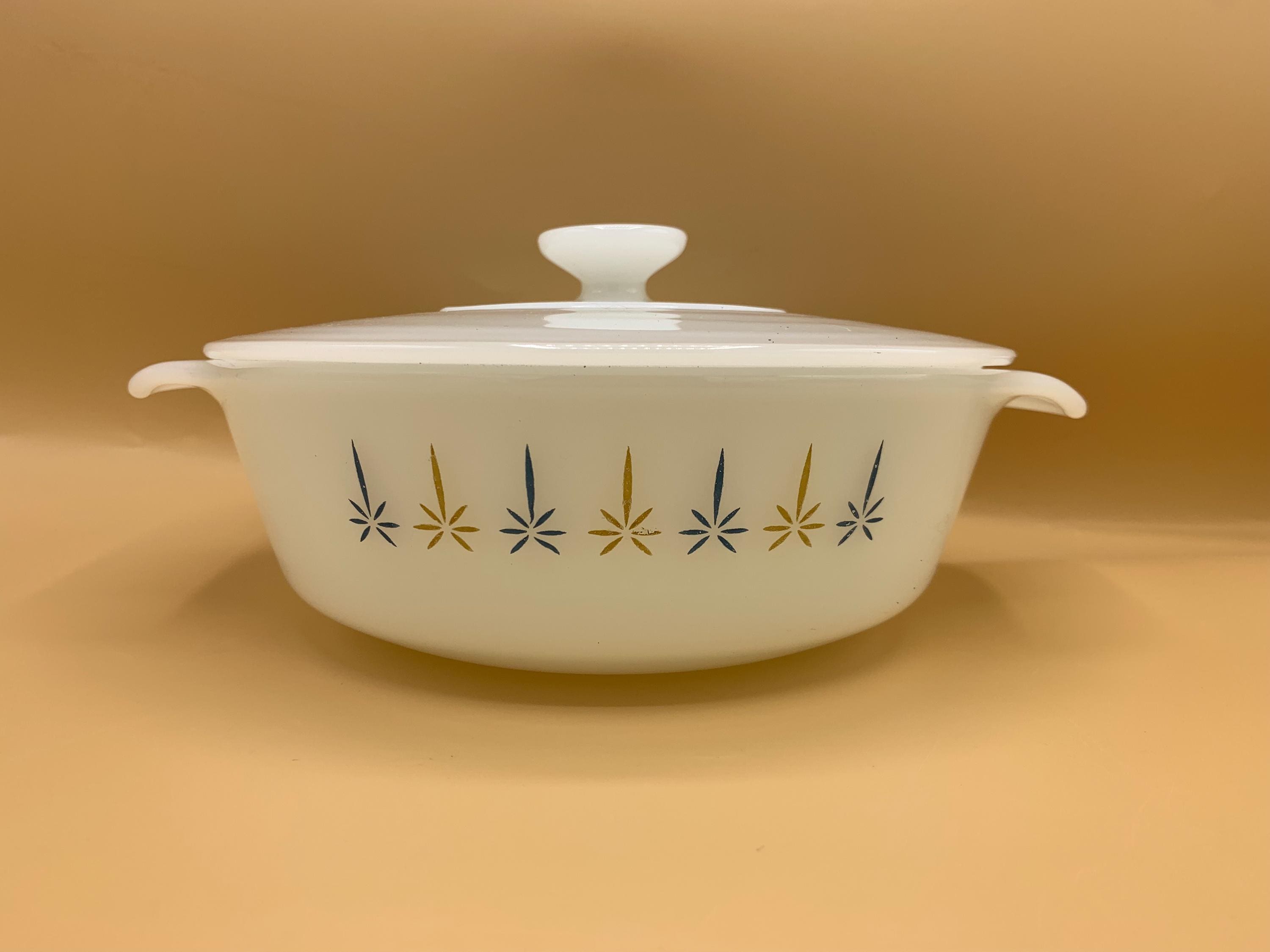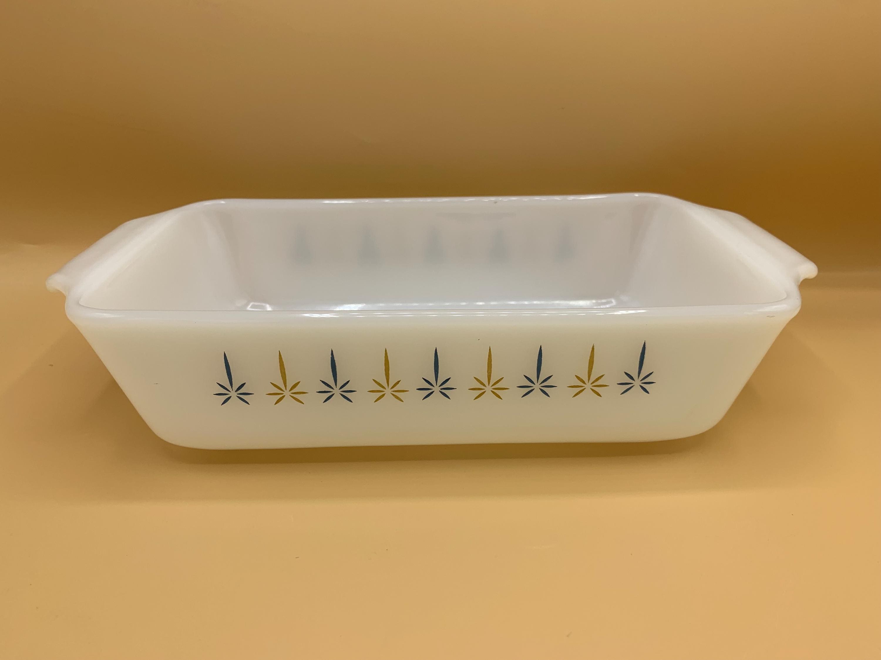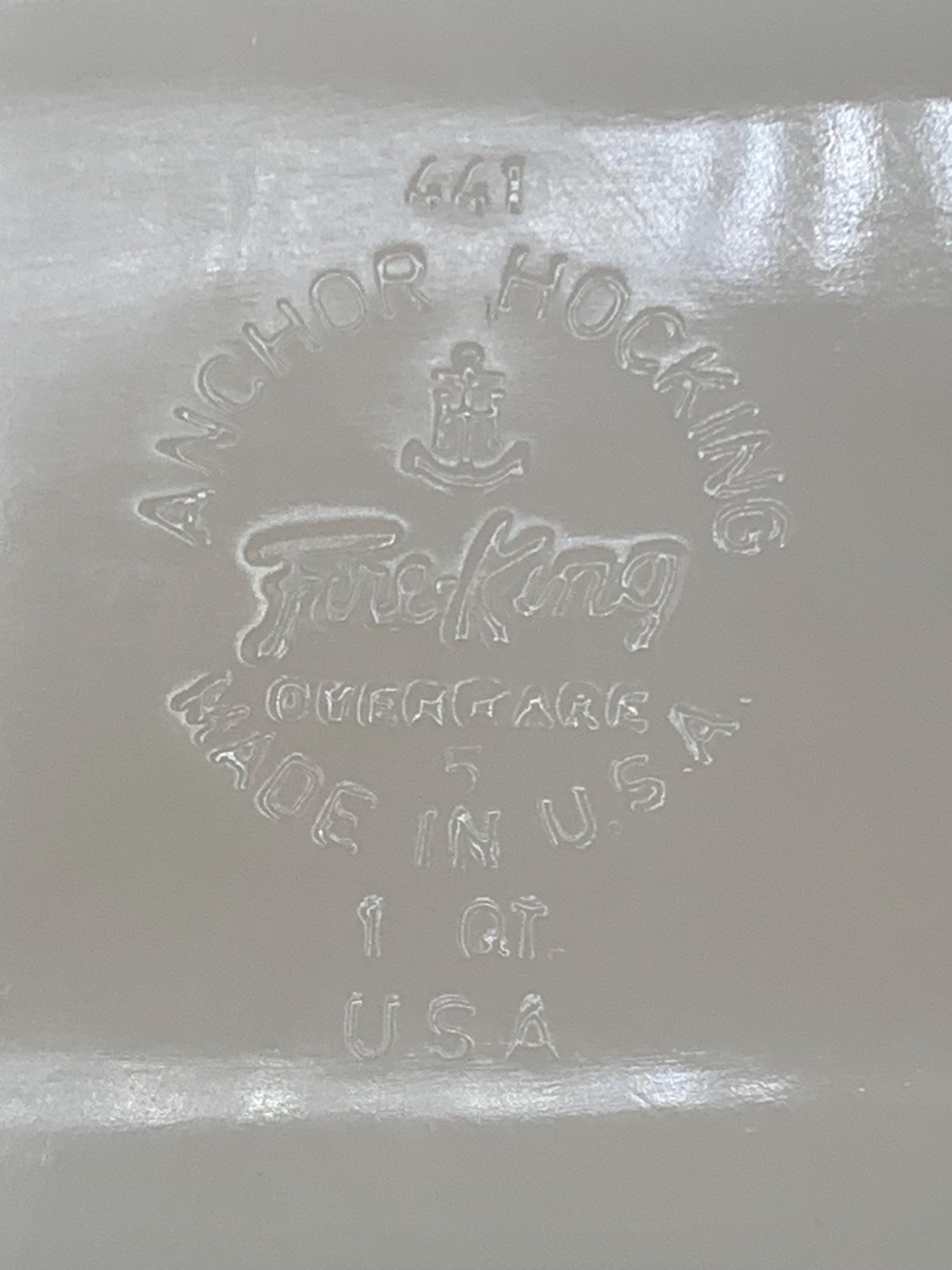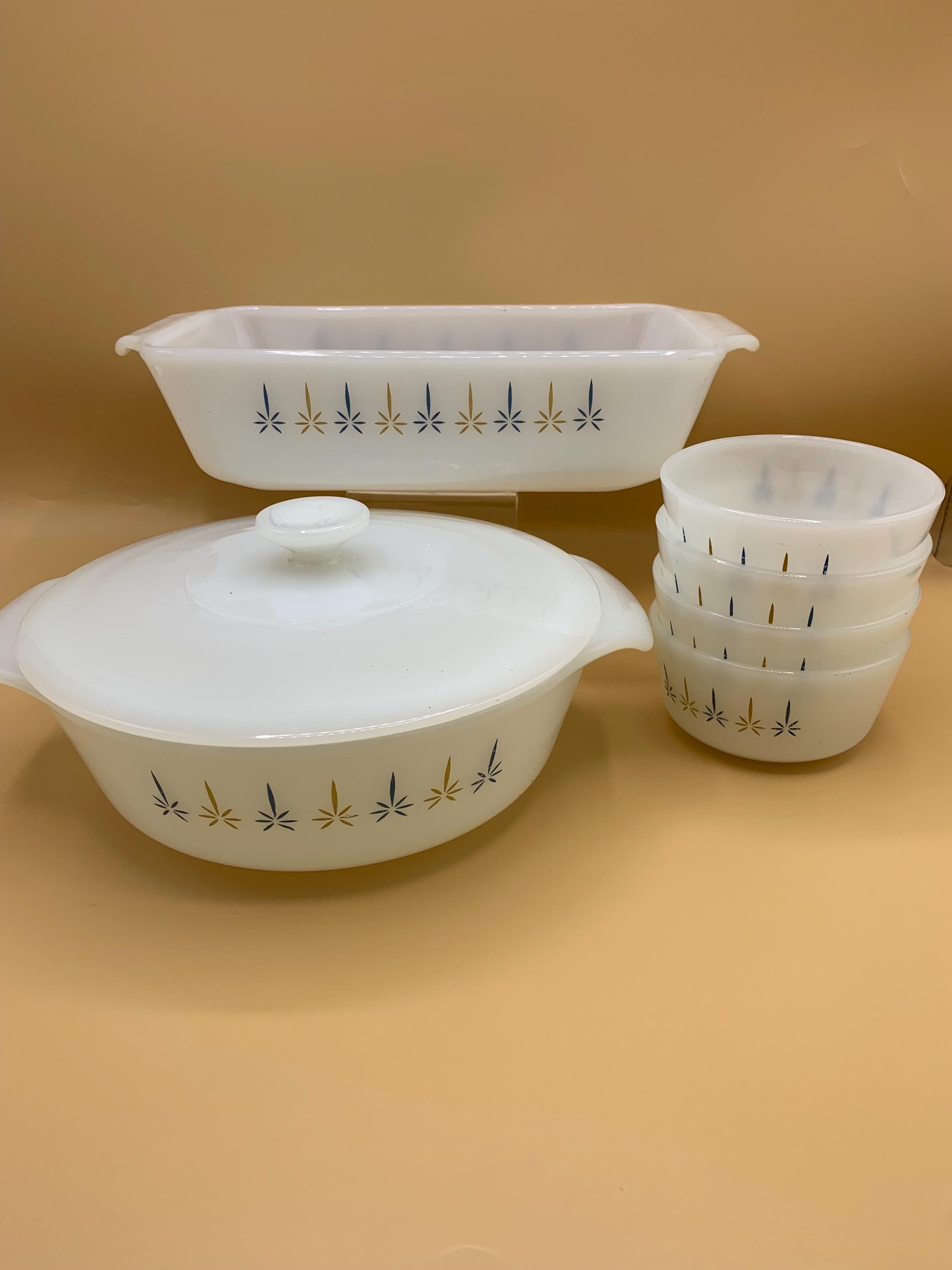 In 1884 oil and natural gas was discovered in Ohio, USA. Natural gas is the primary component needed for high temperature furnaces to make borosilicate and soda lime glass products. This discovery in Ohio led to the establishment of over 70 glass factories in the state. One Lancaster, Ohio factory employed a young Maryland man named Issac (Ike) Jacob Collins (born. 10/27/1864) who worked as a pressed glass decorator. Eventually in 1905, Ike opened his own glassworks factory in Lancaster and named it Hocking Glass Company after Ohio’s Hocking River. Hocking Glass Co. and Ike cemented themselves in the glass products in 1934 with the first non-returnable beer bottle. Prior to Prohibition (that ended Dec. 1933) a person buying “store bought” beer already in a bottle had to leave a deposit on the bottle and would receive the deposit back if returned the bottle. This allowed a “one trip” convenience for beer drinkers. A system still in practice today for all bottle makers. In 1937, Ike merged with Anchor Cap and Closure Corporation to form Anchor Hocking Glass Corporation. When America entered WW2 metal was conserved for the United States military. This meant metal household kitchenware became scarce. So, Anchor Hocking invented an affordable, durable, heat-resistant kitchenware line and named it Fire King by Anchor Hocking Glass Co. Fire-King was popular because of its availability and dependability amongst other glass products. It was sold in stores, but also frequently given away as promotional items in bags of flour or at gas stations. Fire King became a kitchen and restaurant staple during the war and well after. Several decorative patterns and pieces were made until 1975 when dishwashers reportedly were damaging the beautiful patterns that were paint-printed on the Fire King glass pieces. Corning Glass’s Pyrex and Corning-ware lines became the standard choice for oven and kitchen glass and Anchor Hocking started focusing on mass production of other glass products and plasticware items. On October 22, 1975, American glassmaking pioneer Issac “Ike” Jacob Collins died peacefully at his home in Lancaster, Ohio at the age of 100…. five days before his 101st birthday. In 1987, Ike's original company of Anchor Hocking Glass was sold to the Newell Corporation. In 2000, the Newell Corporation reissued the Fire King products as a commemorative line called Fire King 2000. The millennial pieces are recollections of the mid-20th century patterns and pieces, but this round the glass is dishwasher safe. The new releases were only made that year. Today, the Anchor Hocking brand is owned by the Oneida Group in New York, headquartered in Columbus, Ohio and proudly still made in Lancaster, Ohio-USA. But sadly, the Fire King products are a memory. ALL ITEMS IN PHOTOS ARE INCLUDED IN PURCHASE: Made in Lancaster, Ohio 1967-1972 Pattern name- CANDLE GLOW •FIRE KING OVENWARE• One- 1.5 Quart Round 2-Handled Casserole Dish with Lid (not cover) counted as 1 piece Width: 8 1/2 in Height: 4 3/8 in Manufacturer Number: 437 One-1 Quart Rectangular Loaf Pan Length: 10 7/8 in Width: 5 3/8 in Manufacturer Number: 441 Four-Custard Cups Height: 17/8 in Width: 3 3/4 in Manufacturer Number: 434