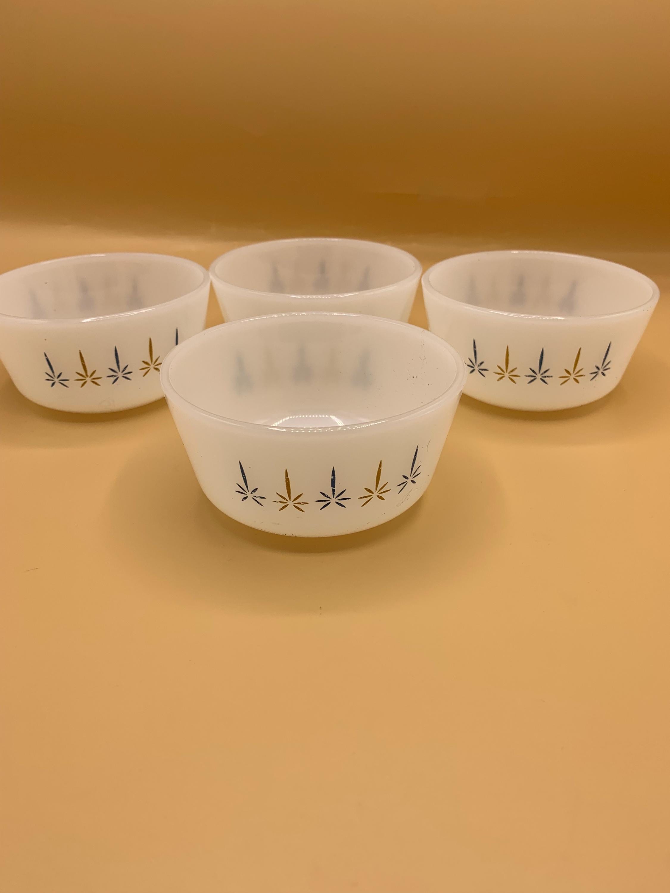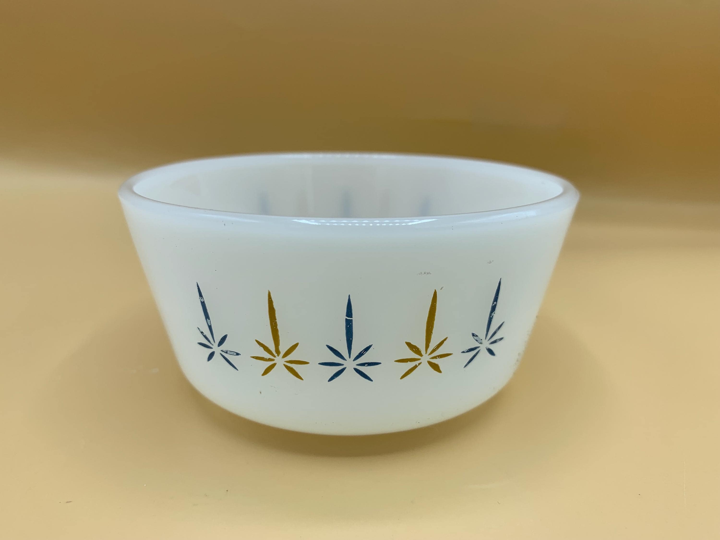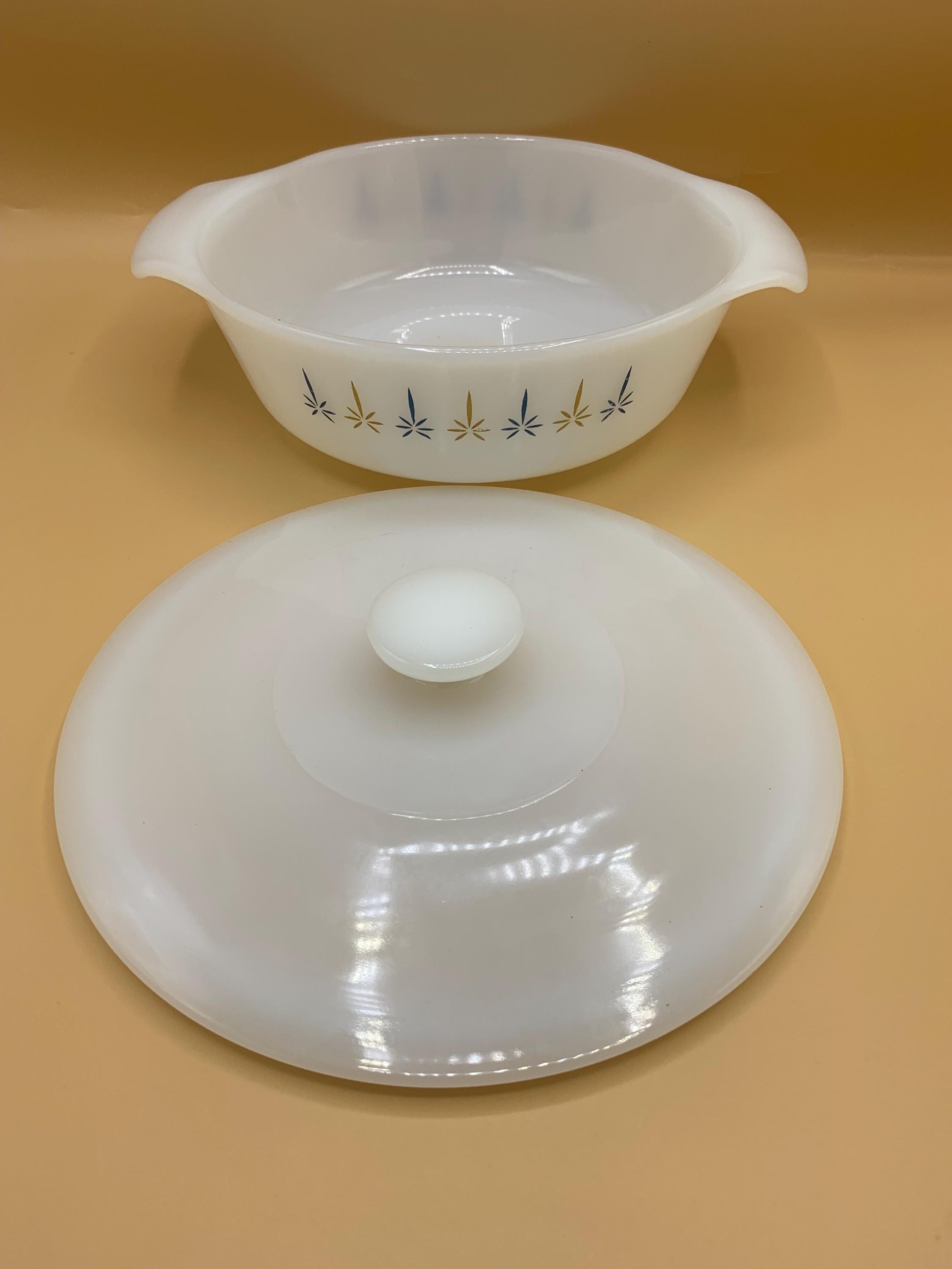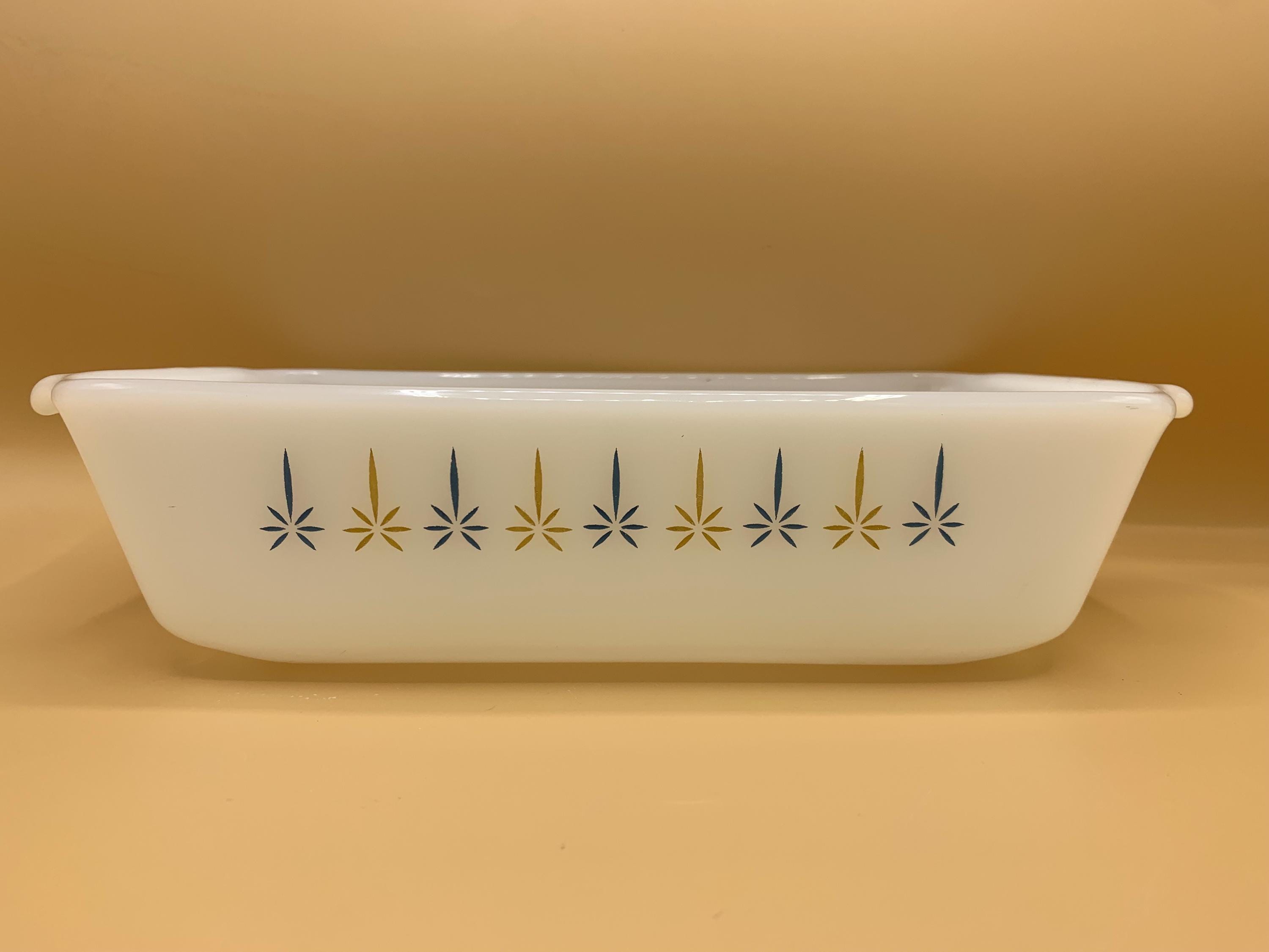 In 1884 oil and natural gas was discovered in Ohio, USA. Natural gas is the primary component needed for high temperature furnaces to make borosilicate and soda lime glass products. This discovery in Ohio led to the establishment of over 70 glass factories in the state. One Lancaster, Ohio factory employed a young Maryland man named Issac (Ike) Jacob Collins (born. 10/27/1864) who worked as a pressed glass decorator. Eventually in 1905, Ike opened his own glassworks factory in Lancaster and named it Hocking Glass Company after Ohio’s Hocking River. Hocking Glass Co. and Ike cemented themselves in the glass products in 1934 with the first non-returnable beer bottle. Prior to Prohibition (that ended Dec. 1933) a person buying “store bought” beer already in a bottle had to leave a deposit on the bottle and would receive the deposit back if returned the bottle. This allowed a “one trip” convenience for beer drinkers. A system still in practice today for all bottle makers. In 1937, Ike merged with Anchor Cap and Closure Corporation to form Anchor Hocking Glass Corporation. When America entered WW2 metal was conserved for the United States military. This meant metal household kitchenware became scarce. So, Anchor Hocking invented an affordable, durable, heat-resistant kitchenware line and named it Fire King by Anchor Hocking Glass Co. Fire-King was popular because of its availability and dependability amongst other glass products. It was sold in stores, but also frequently given away as promotional items in bags of flour or at gas stations. Fire King became a kitchen and restaurant staple during the war and well after. Several decorative patterns and pieces were made until 1975 when dishwashers reportedly were damaging the beautiful patterns that were paint-printed on the Fire King glass pieces. Corning Glass’s Pyrex and Corning-ware lines became the standard choice for oven and kitchen glass and Anchor Hocking started focusing on mass production of other glass products and plasticware items. On October 22, 1975, American glassmaking pioneer Issac “Ike” Jacob Collins died peacefully at his home in Lancaster, Ohio at the age of 100…. five days before his 101st birthday. In 1987, Ike's original company of Anchor Hocking Glass was sold to the Newell Corporation. In 2000, the Newell Corporation reissued the Fire King products as a commemorative line called Fire King 2000. The millennial pieces are recollections of the mid-20th century patterns and pieces, but this round the glass is dishwasher safe. The new releases were only made that year. Today, the Anchor Hocking brand is owned by the Oneida Group in New York, headquartered in Columbus, Ohio and proudly still made in Lancaster, Ohio-USA. But sadly, the Fire King products are a memory. ALL ITEMS IN PHOTOS ARE INCLUDED IN PURCHASE: Made in Lancaster, Ohio 1967-1972 Pattern name- CANDLE GLOW •FIRE KING OVENWARE• One- 1.5 Quart Round 2-Handled Casserole Dish with Lid (not cover) counted as 1 piece Width: 8 1/2 in Height: 4 3/8 in Manufacturer Number: 437 One-1 Quart Rectangular Loaf Pan Length: 10 7/8 in Width: 5 3/8 in Manufacturer Number: 441 Four-Custard Cups Height: 17/8 in Width: 3 3/4 in Manufacturer Number: 434