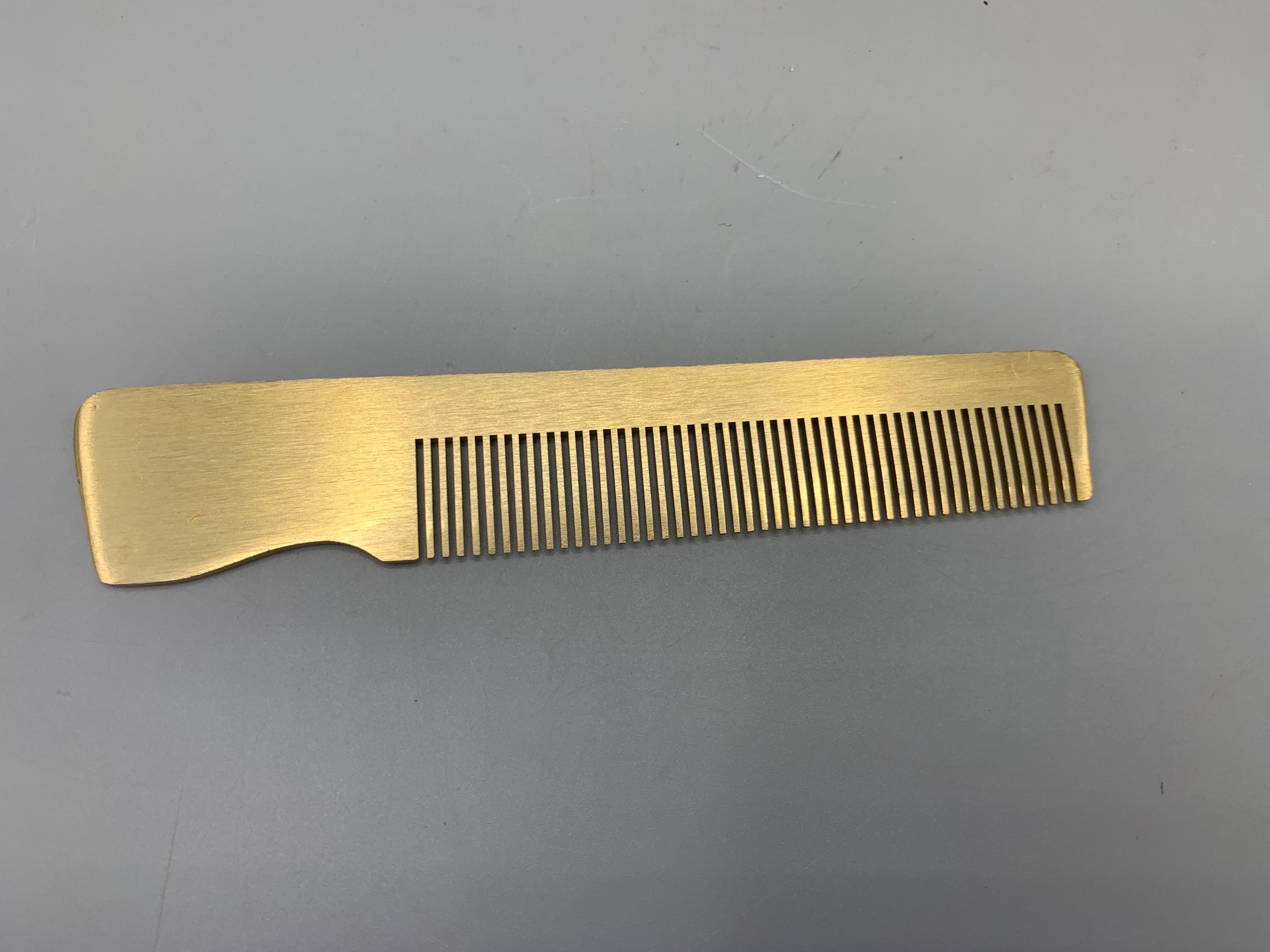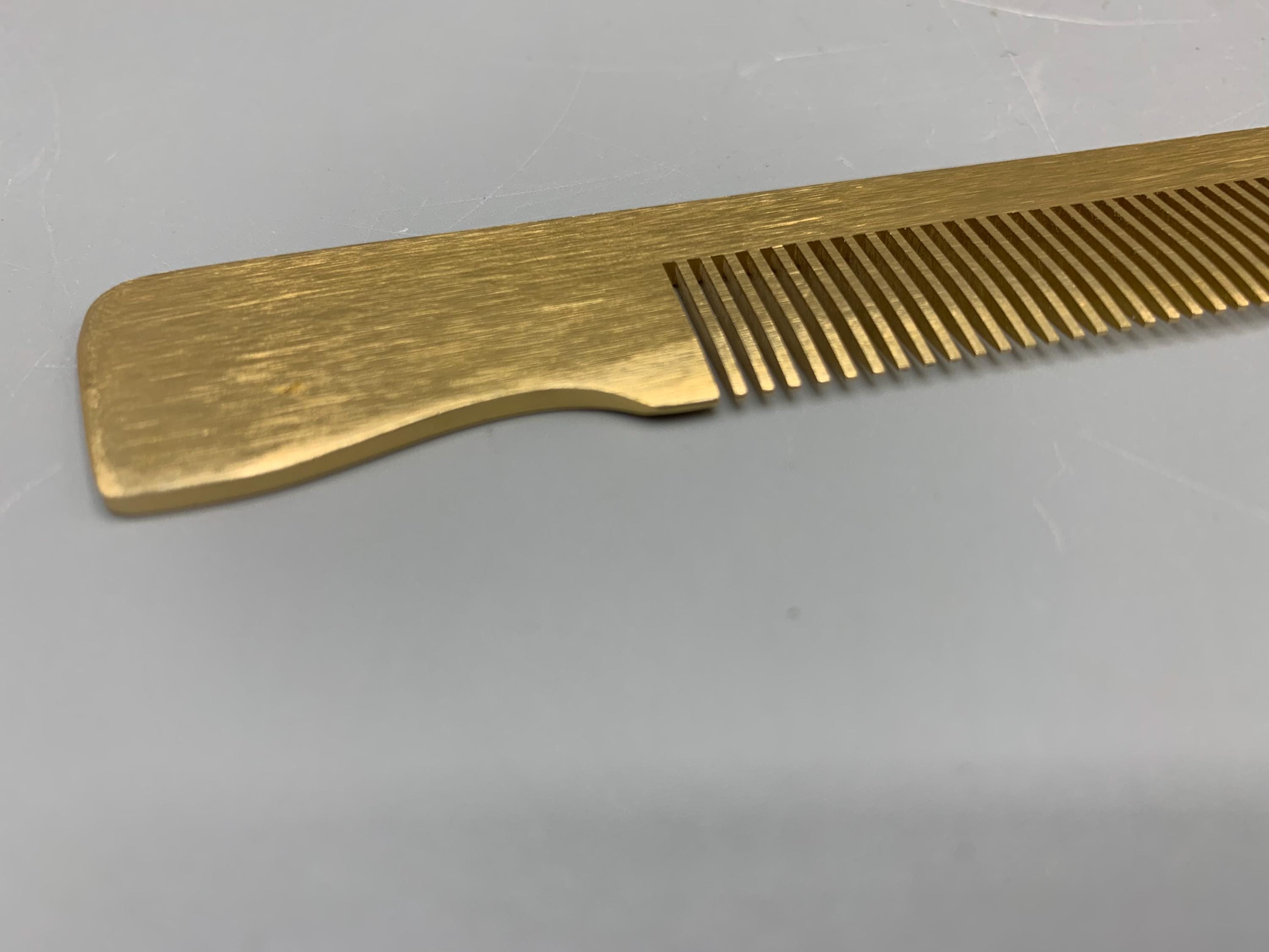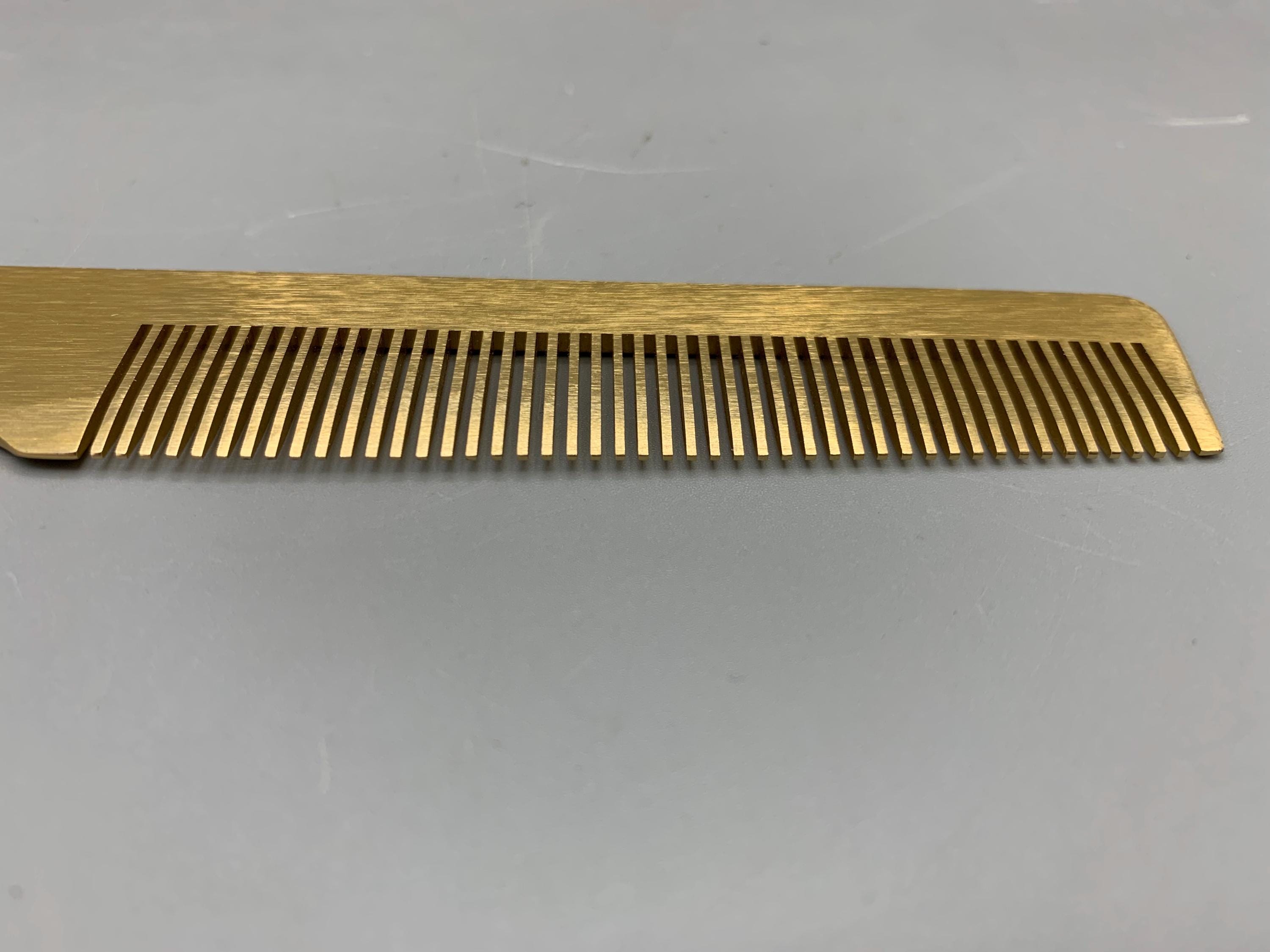 This comb was custom made by Krest Comb Co. (est. 1958) of Leominster, Massachusetts. It is a 5” gold-toned aluminum “fine tooth” barber’s comb.