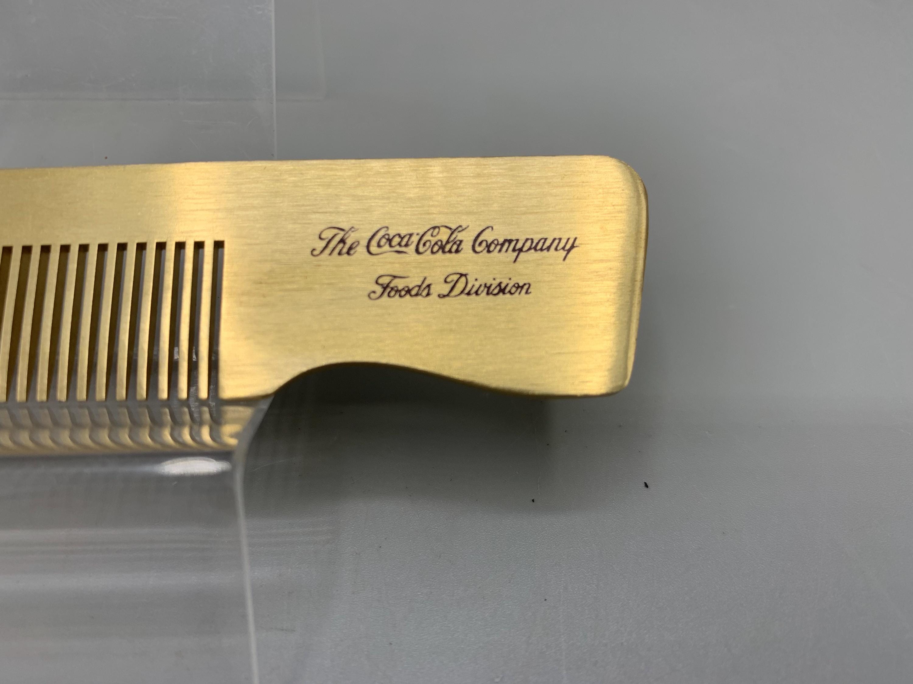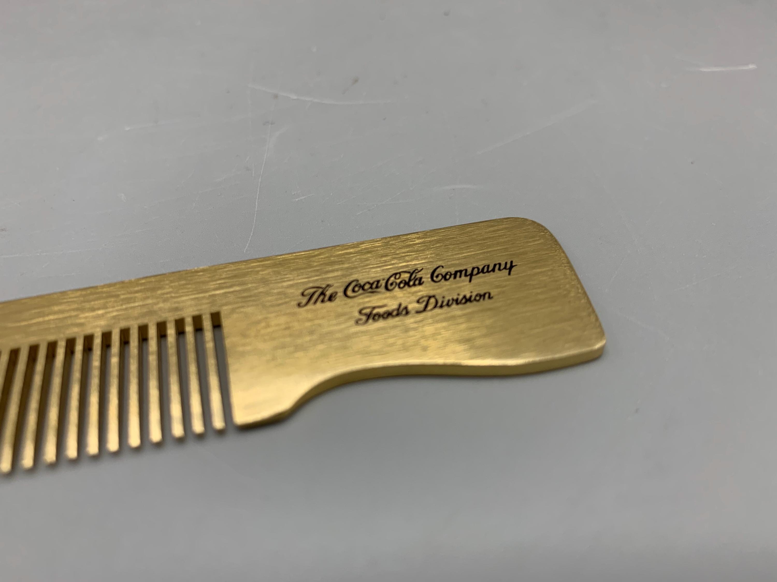Krest made this comb and a few others like it exclusively for Coca-Cola in 1985 in gold to commemorate the first change in Coke’s classic recipe and their new “coke can” feature. It was called “NEW COKE” and the 12oz cans featured the normal red, white and silver wavy banners but now with a GOLD” top so you could tell the difference from just “plain ole Coke”. The combs were given to a select few in the Coca-Cola Foods Division in Houston, Texas during the marketing event as corporate gifts…very rare design and not many were given out due to the 1985 New Coke campaign and recipe switch only lasting 79 days.