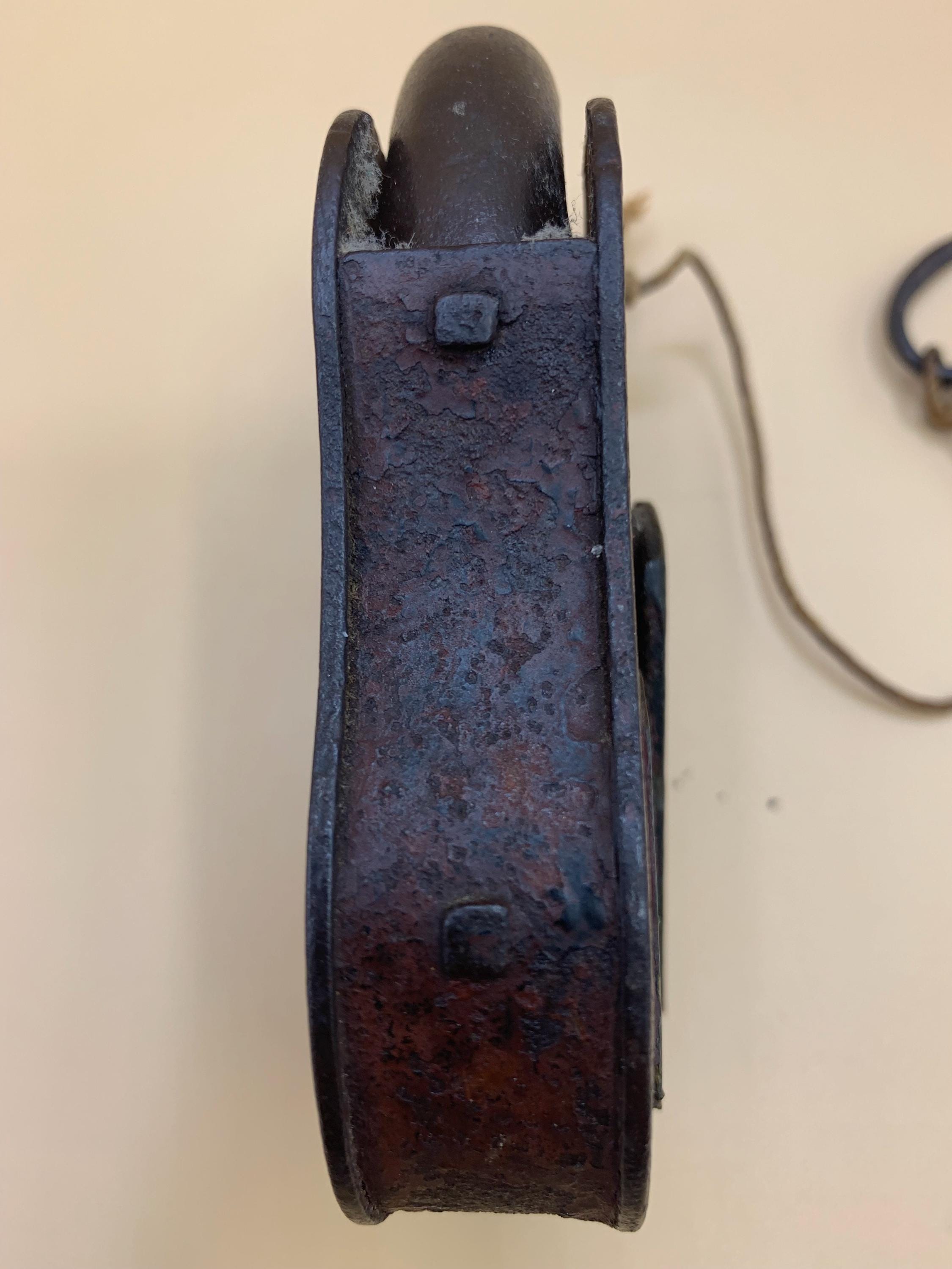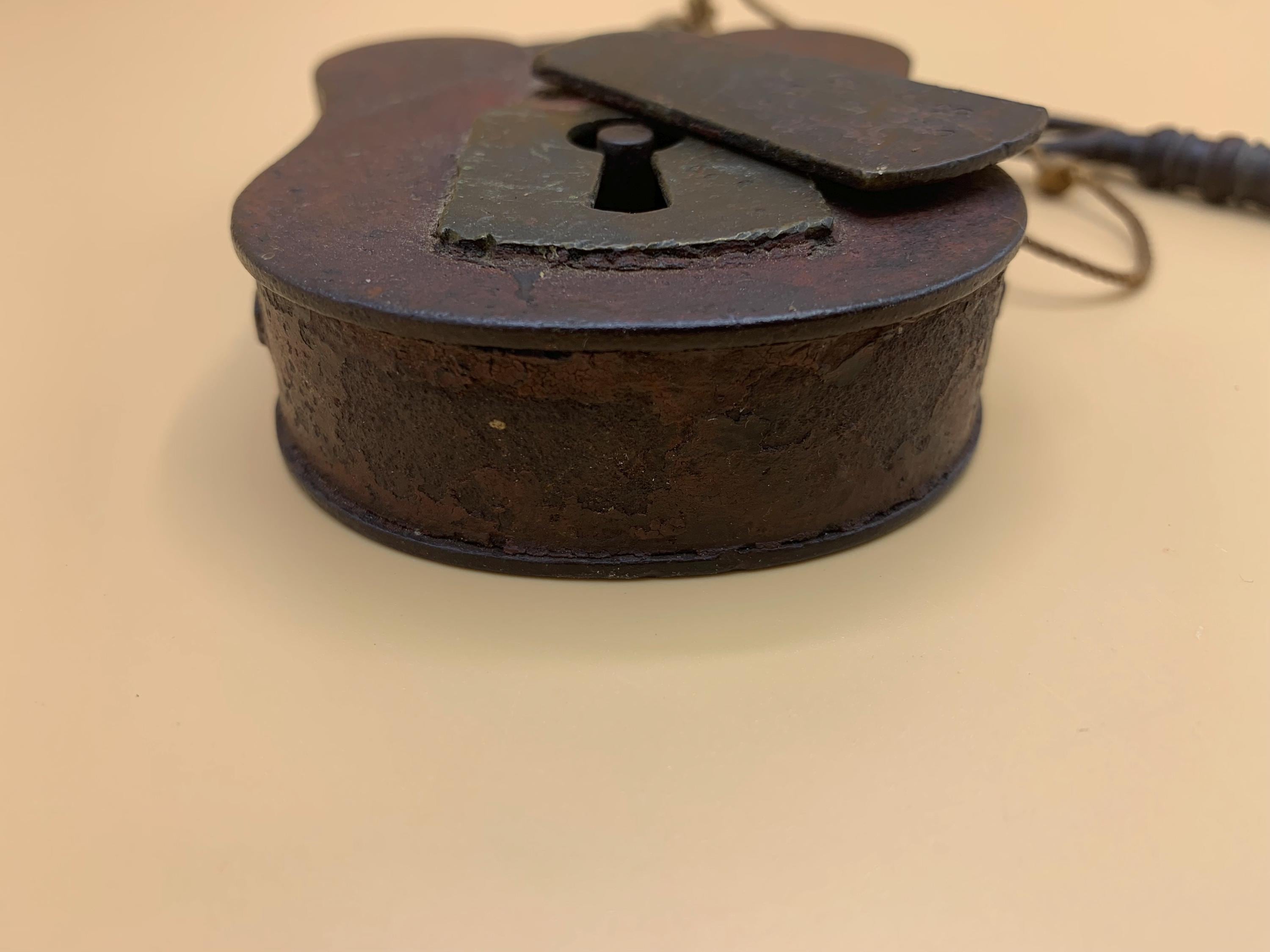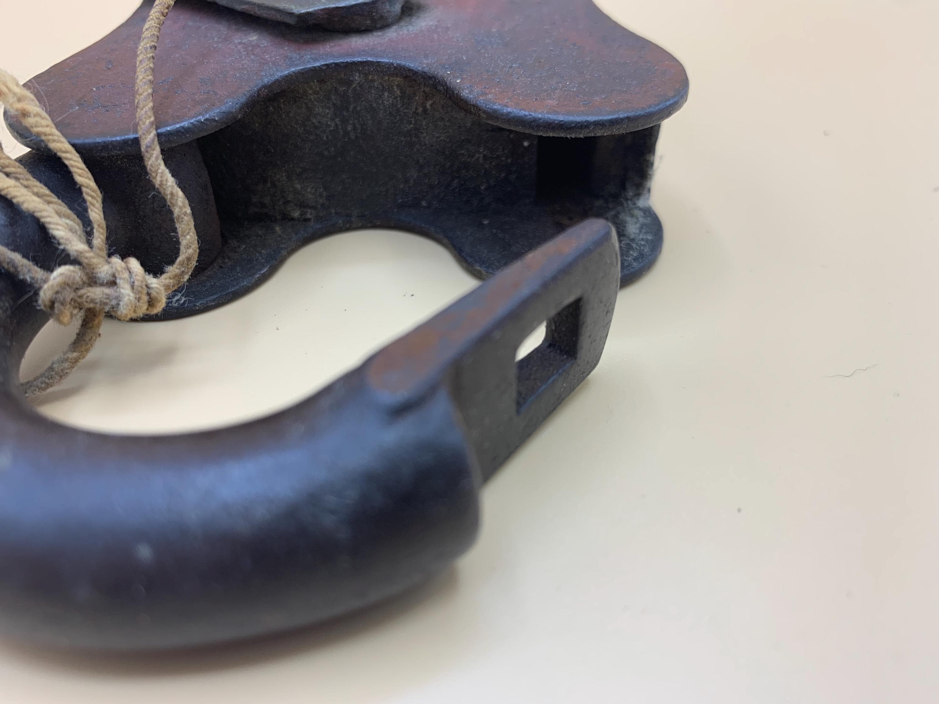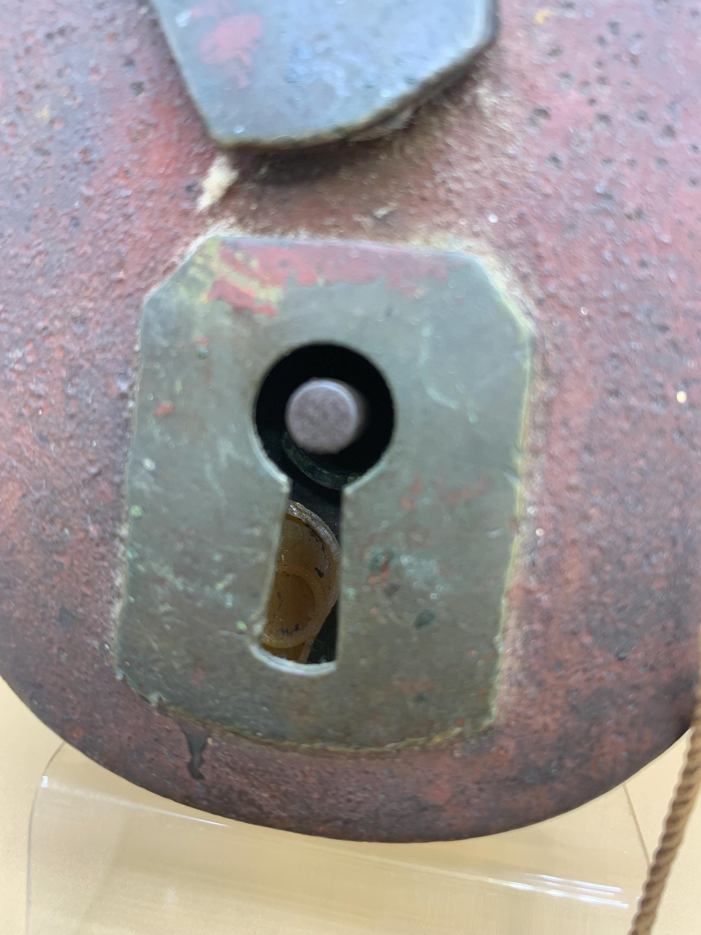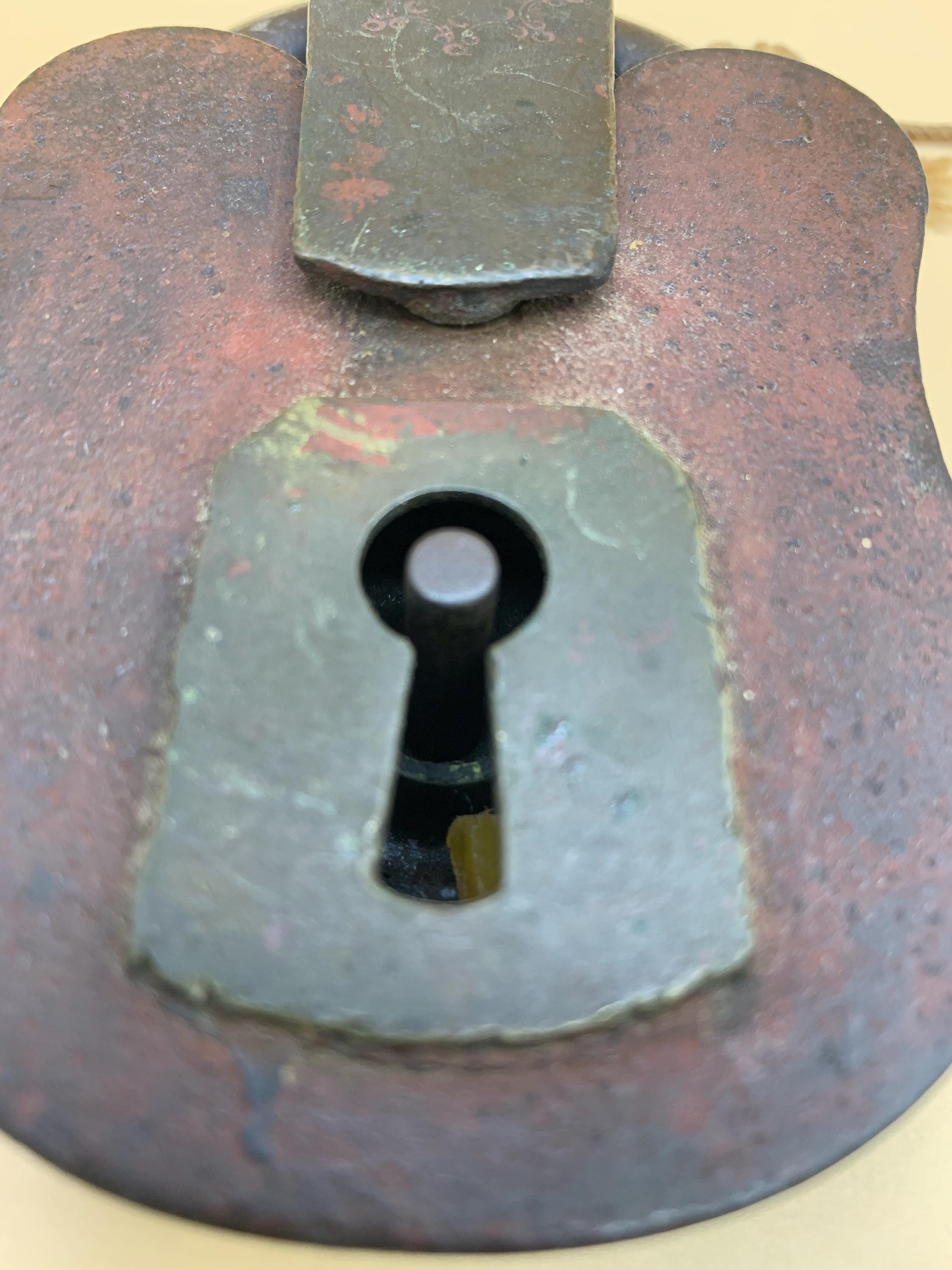 Original Color/Protective Coat: Railroad Red- American Railroad companies would have their safety and security padlocks painted red when made. This was the method used to help railroad workers to locate the “switch car” boxes and other locked equipment. It also acted as a distinctive feature for identifying the locks if stolen for Warded locks with skeleton keys were easy to “pick open”. Sort of like Mid-20th handcuffs when used comparable keys.