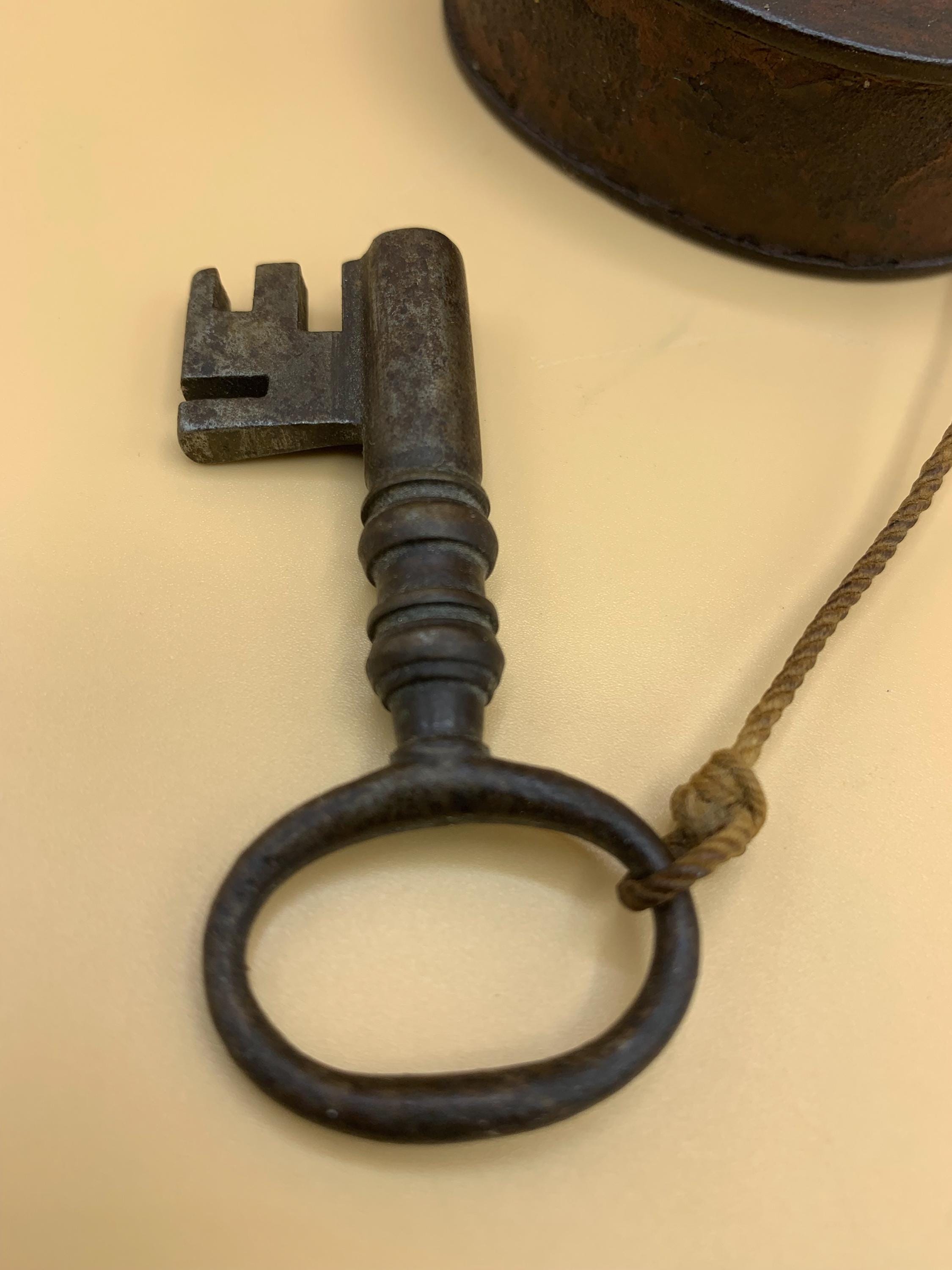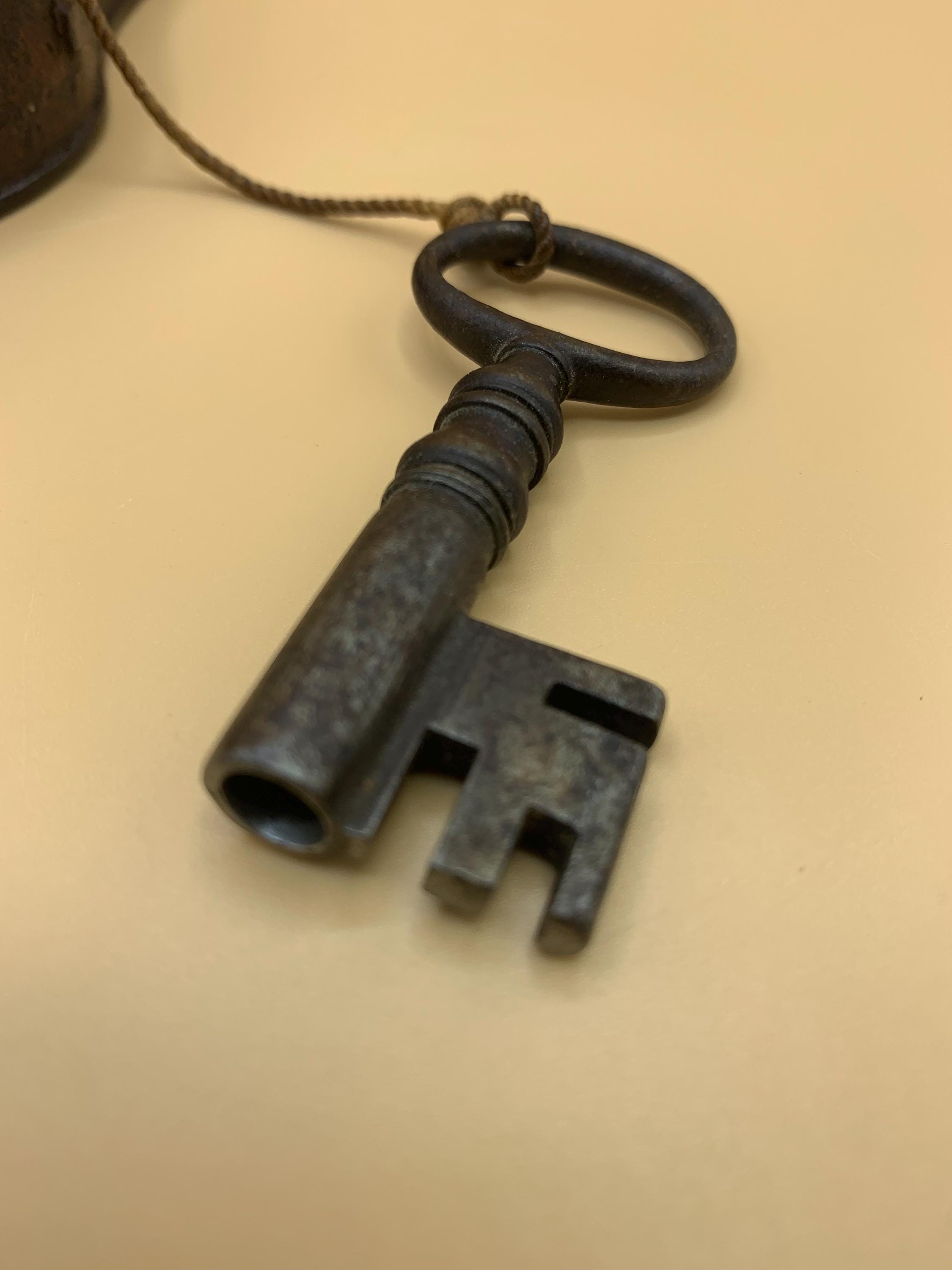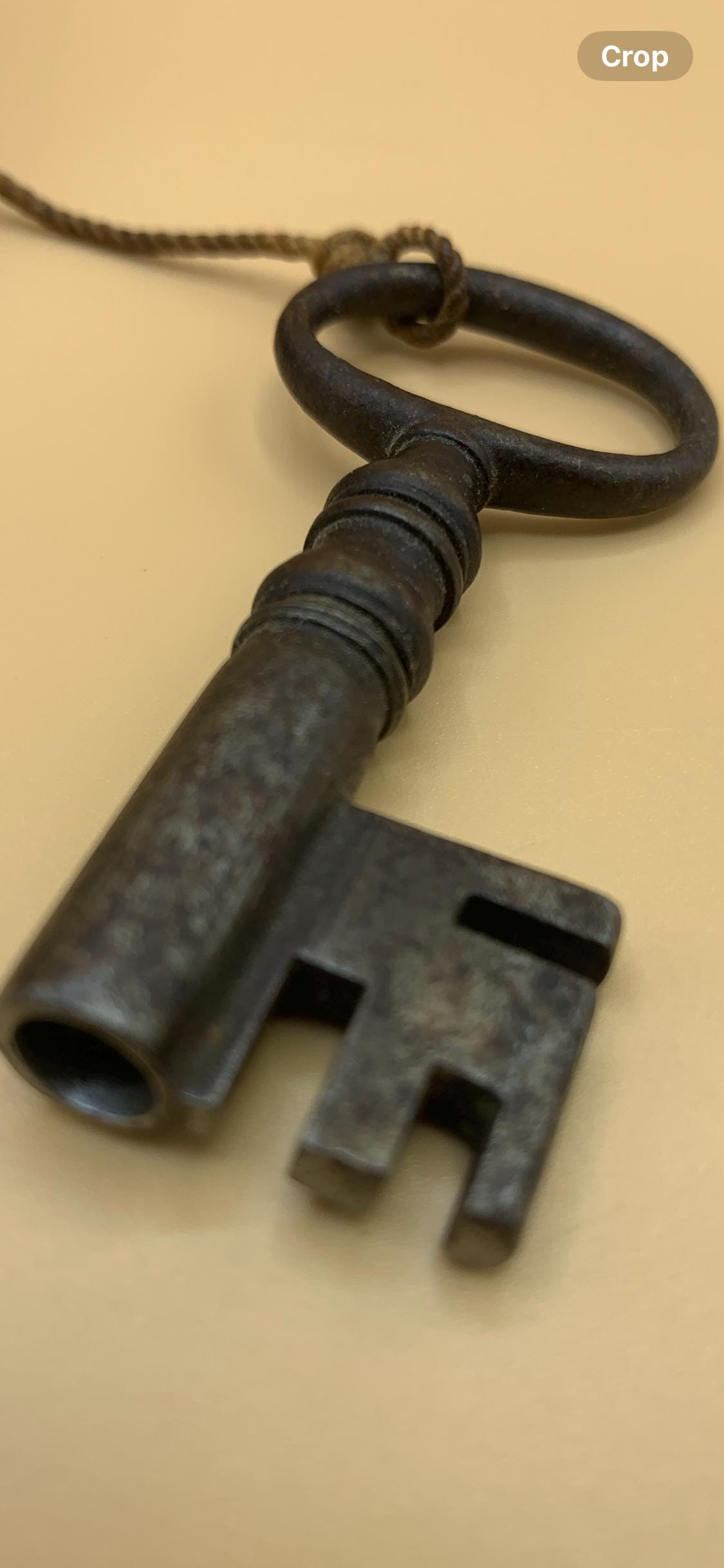 Skeleton keys have a hollow barrel, a large circular bow (handle), and a bit part that engages the lock mechanism. The name "skeleton" comes from the key being stripped down to its essential parts needed to operate the lock, not from its appearance. (2.75” on roped twine)